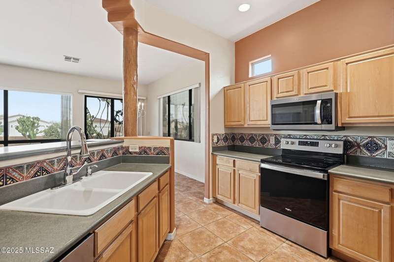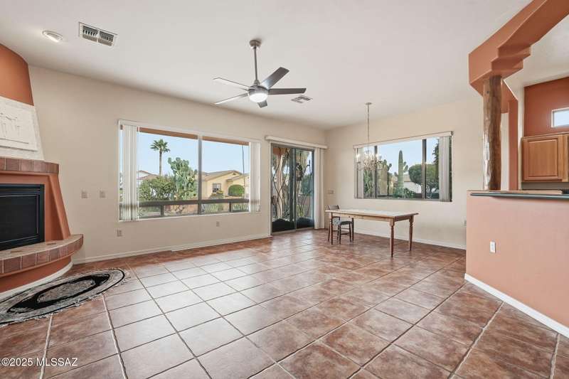 Discover easy southern AZ living in this updated Santa Fe style home with the largest floor plan (1,579 sq. ft.) in the popular, gated subdivision of The Legends. This 2 bedroom, 2 bath layout includes a den/office, 2 car garage, and a spacious Great Room with a gas beehive fireplace for those chilly winter mornings! Yes, even in AZ! And, there are ceiling fans in every room to keep you cool in summer. The open kitchen is accented with peeled wooden poles and corbels and features lots of maple cabinets and countertop space. Enjoy the SE mountain view in back from the covered patio and you'll love the enclosed front courtyard perfect for the desert sunsets. There's a 2 car garage, a flat roof for easy maintenance, and no carpet. Plus, there's a private neighborhood pool!