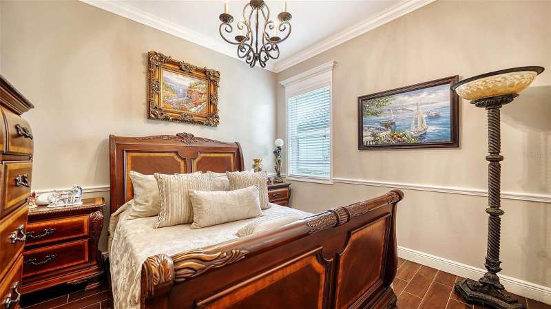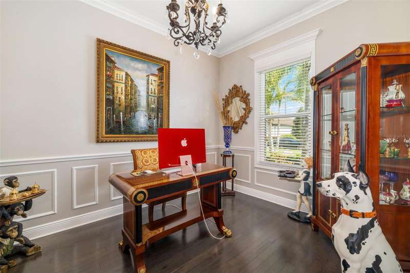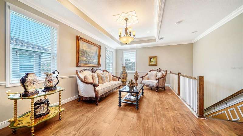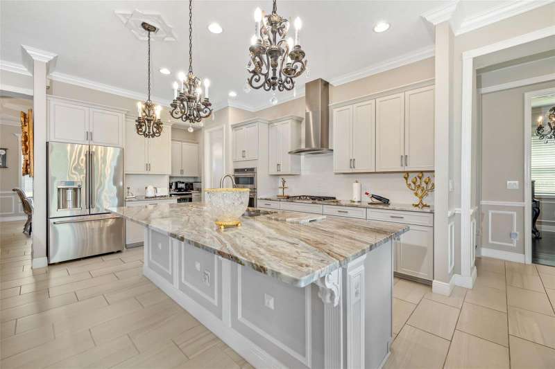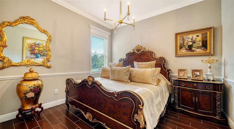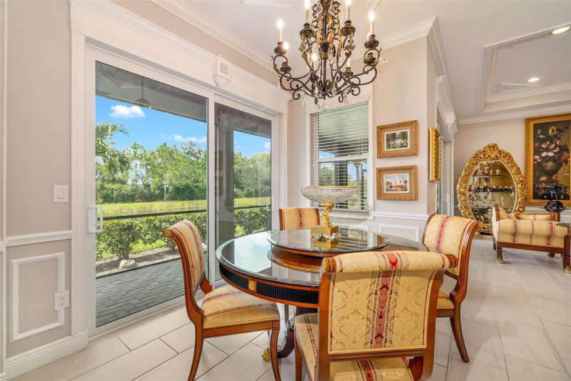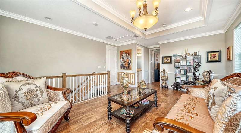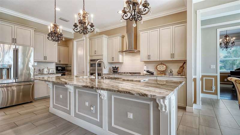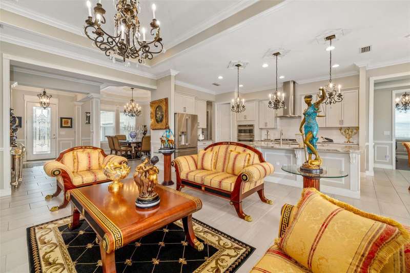 Nestled behind the gates of Rivo Lakes, this stunning home exudes timeless elegance with its impressive Tuscan-inspired facade and exquisite stone accents. FRESHLY PAINTED LIVING AREA, BEAUTIFUL LIGHT NEUTRAL COLOR. The meticulously landscaped grounds are adorned with lush tropical foliage, setting the stage for a truly exceptional living experience. Step inside to find a spacious, open floor plan with soaring ceilings and custom millwork throughout. Gorgeous custom Italian inlays grace the floors, adding sophistication to the space. This home offers 4 spacious bedrooms, 4 luxurious bathrooms, a bonus room, den, formal dining room, and a game room—plenty of space for entertaining or family relaxation. The gourmet kitchen is a chef’s dream, featuring custom cabinetry, granite countertops, high-end stainless steel appliances, and a cozy café dining area. A massive granite center island with counter-height seating seamlessly connects to the expansive family room, creating an ideal flow for both casual and formal gatherings. Upstairs, you'll find a private retreat with a large bonus room, bedroom, and bathroom, offering both comfort and versatility. The master suite is a true sanctuary, located on its own wing of the home, complete with a spa-like 5-piece en-suite and a generously sized walk-in closet. Sliding doors lead to the lanai, where you can relax and enjoy tranquil views of the serene pond. Why wait for new construction when you can move right into this better-than-new, custom home today? Whether you're teeing off at a nearby golf course or enjoying cocktails with friends, this home is the perfect setting for every lifestyle. Priced to sell...welcome home!
