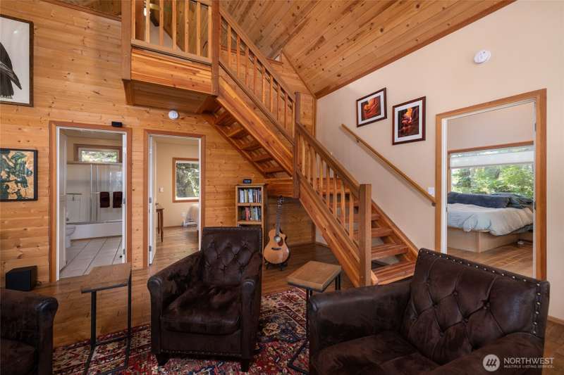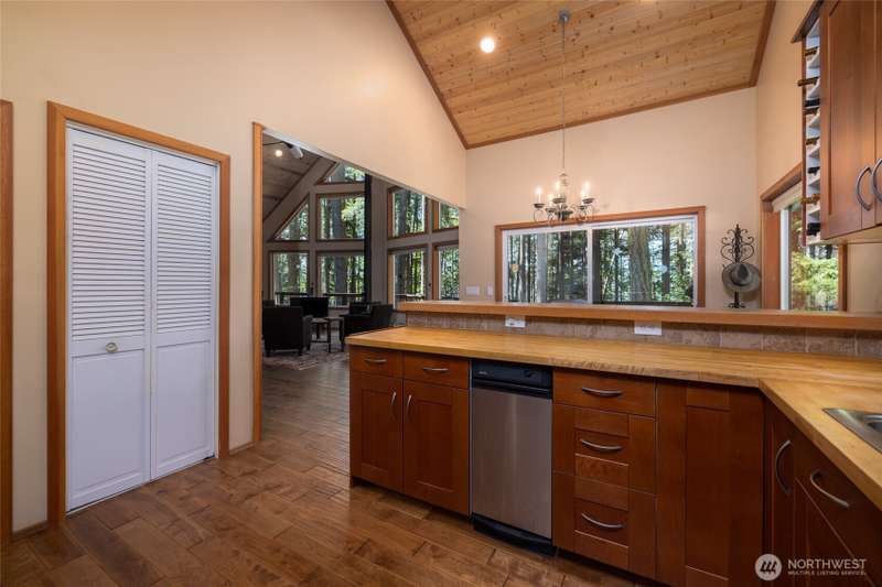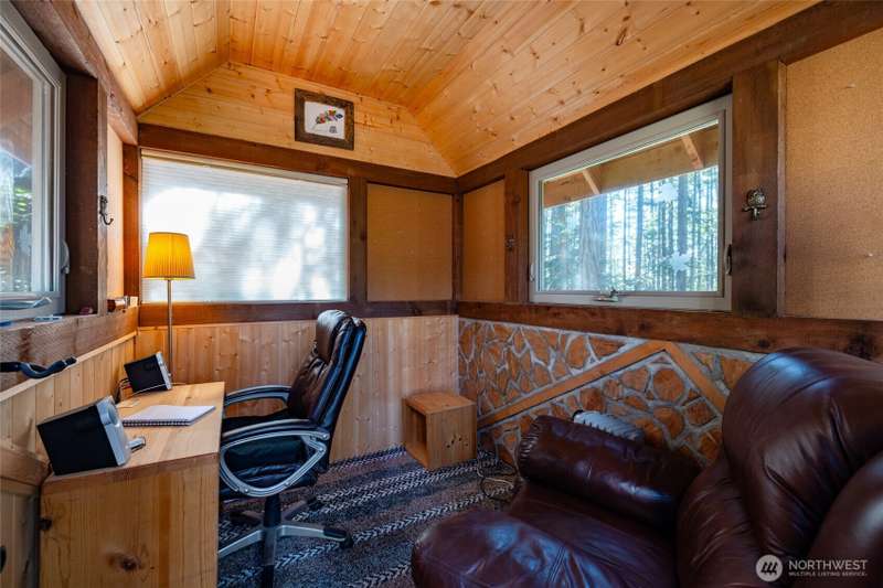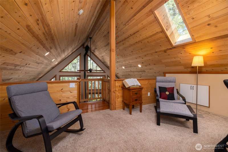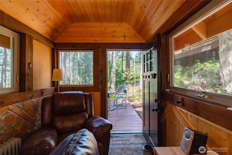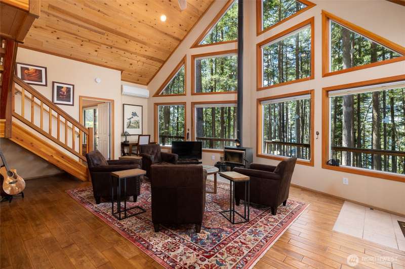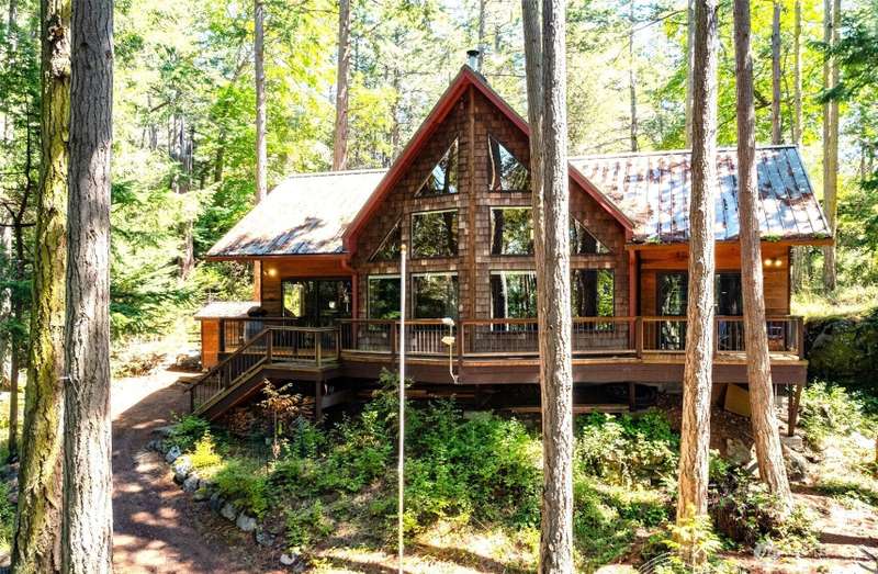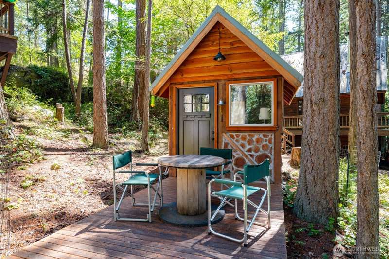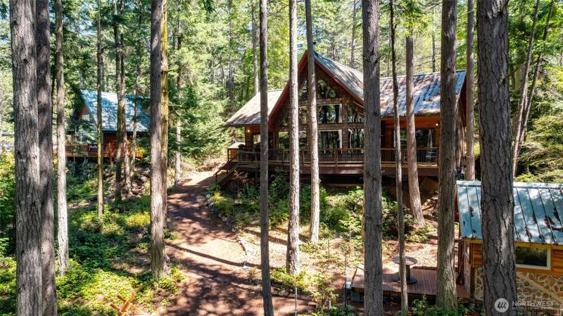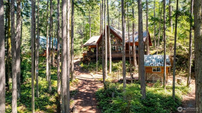 Move-in ready! Beautiful custom home, nestled on a quiet cul-de-sac at the south end of Center Island. Sparkling water views through the trees and an open floorplan that's ideal for entertaining and sharing with friends. The house has hardwood floors, a cathedral ceiling, central woodstove, ductless heat pump and large windows capturing the territorial views. Featuring two generous main floor bedrooms, a loft, 1 3/4 baths, and a kitchen with abundant cabinets and an amazing workspace. Separate cordwood building, once a writer's studio, could make a fun bunkhouse. This home is your perfect island getaway! Enjoy the perks of two community docks, a caretaker, a private airstrip, beach access, and even a golf cart! Turn-Key