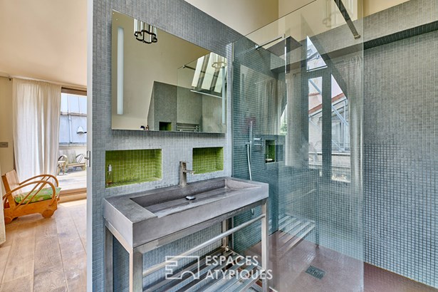 Upon entering, a planted terrace invites you to relax before discovering a vast living room bathed in light, with generous volumes and impressively high ceilings. It features an open-plan kitchen with a dining area, a cozy living room punctuated by a monumental library extending to the mezzanine, and a distinct loft ambiance combining raw metal, light wood, and original industrial elements.