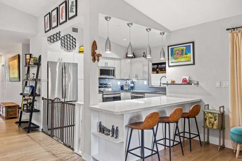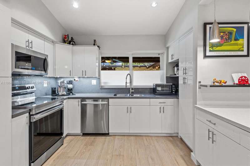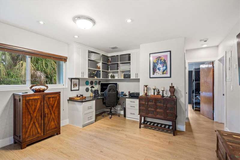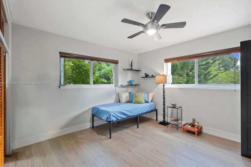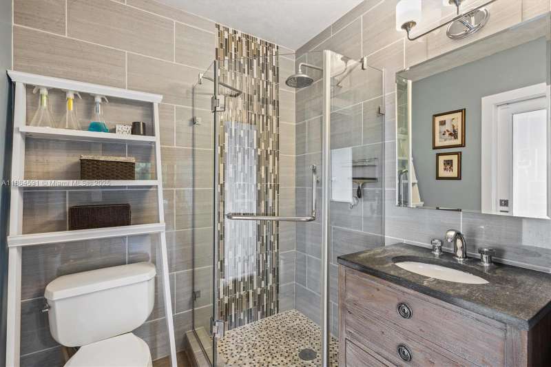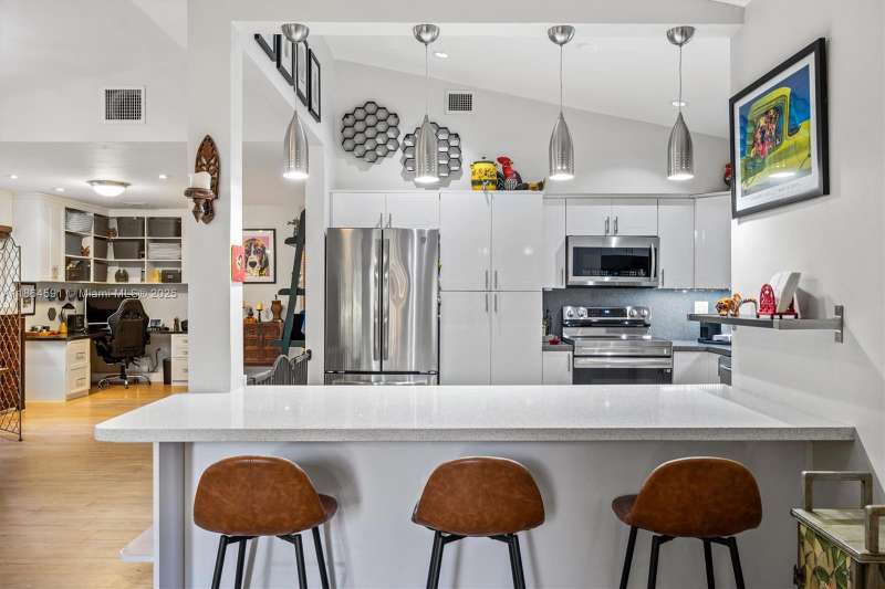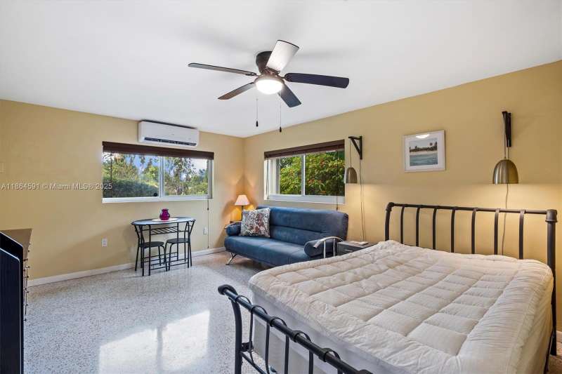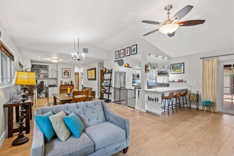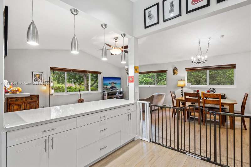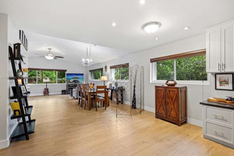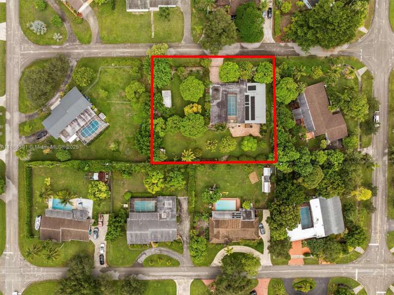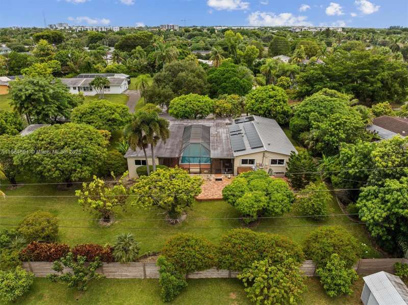 No HOA!! Low Taxes & Not Flood Zone (Elevation 13 Ft.) Private Garden Paradise with over 1/2 acre lot (25,200 sqft), Mango, Avocado, Lychee, Longan trees. Beautiful 1-story house, 3 bedr., 2 bath, plus 1/1 separate Guest House or In-Law Quarters with living room. 3rd bedr. currently used as open layout office. 2019 Main House Metal Roof & Solar Panels. Both structures built around a 6 Foot Saltwater & Heated Pool, screened w/outdoor sitting area & quartz counter from kitchen into pool area to enjoy & relax. Gorgeous kitchen with cathedral ceiling, quartz counter tops, SS appliances, 2 garage, auto sprinkler, well irrigation, impact glass main house, accordion shutters double protection, wood carved front door, 2022 A/C, space for boat & RV. Great Schools & Close to Palmetto Bay Park.