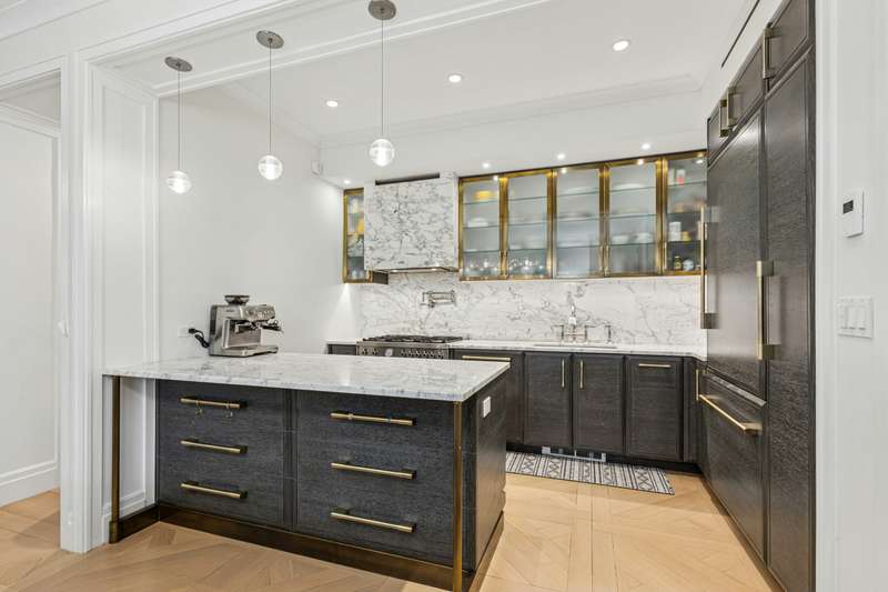 The chef's kitchen is thoughtfully designed with Calacatta countertops, a breakfast bar, oak cabinetry, a Sub-Zero, and a Bertazzoni stove/oven.