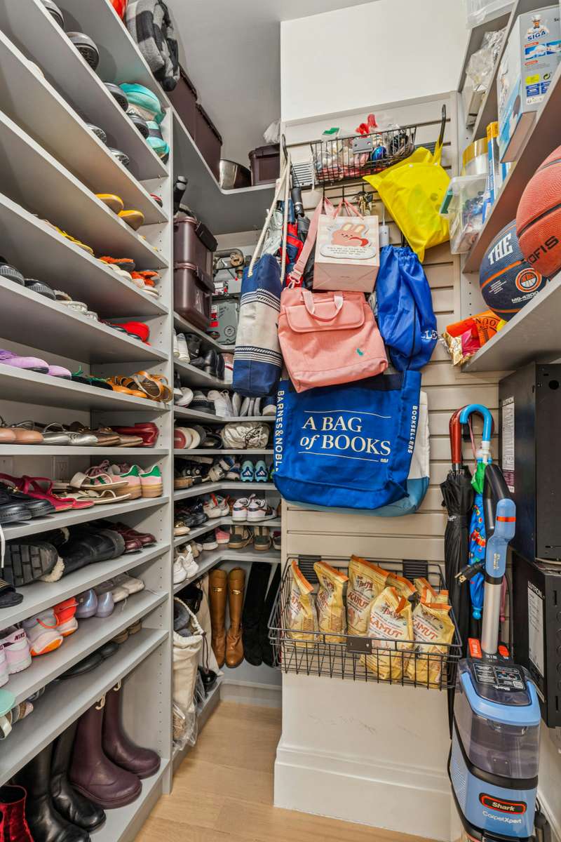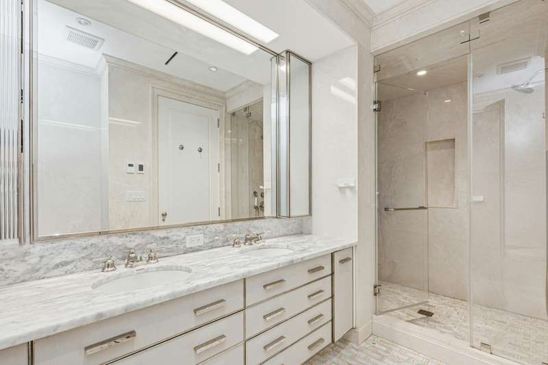 The primary bedroom receives beautiful morning light from the east. It features an inviting spa-like bathroom with a mosaic marble floor, custom vanities, a marble countertop, and a spacious walk-in closet.