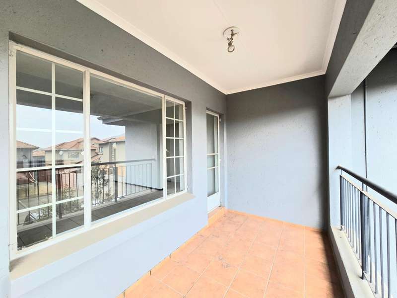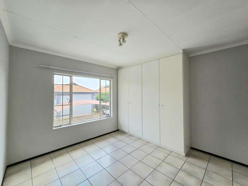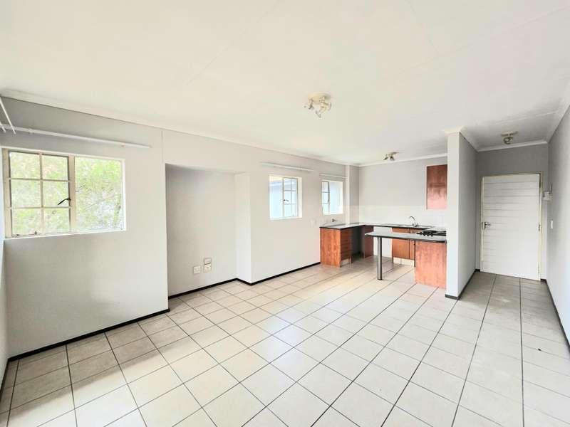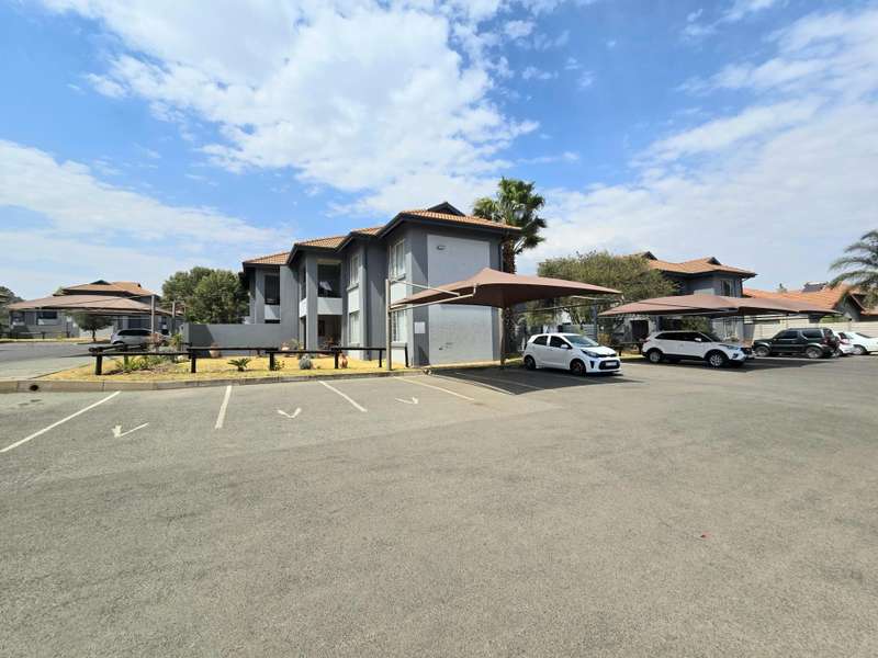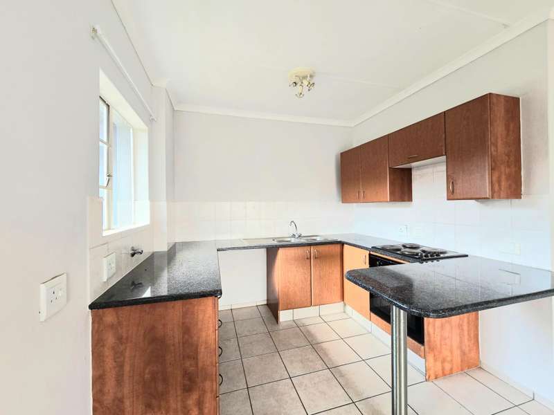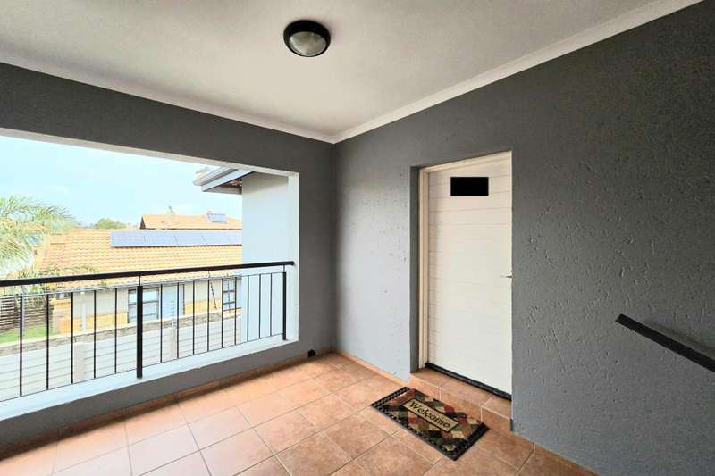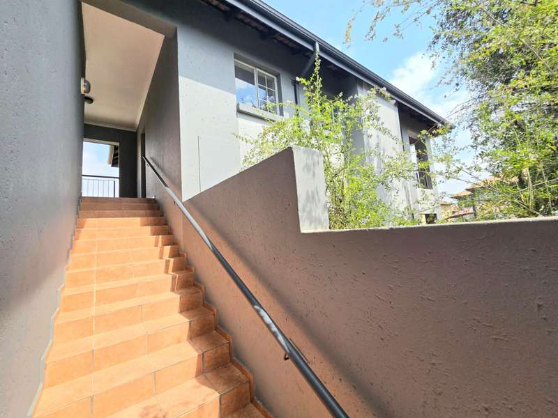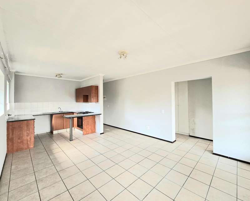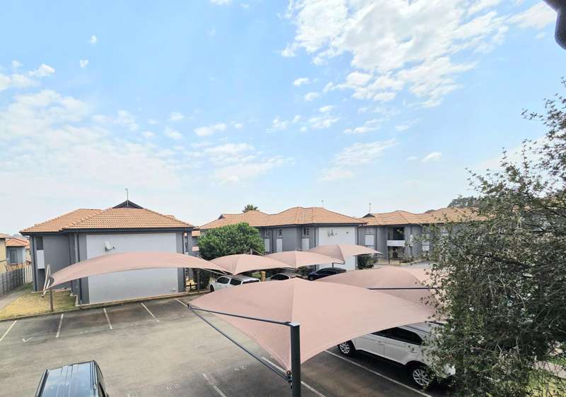 2 Bedroom, 2 Bathroom, First floor, 80sqm Townhouse. Open plan kitchen and lounge area. En-suite bathroom. Built-in-cupboards. Covered patio. 1 x Covered parking, 1 x open parking including visitor's parking. Estimate Levies R1300pm Estimate Rates R600pm Kids play area. Pool with braai and entertainment area.
