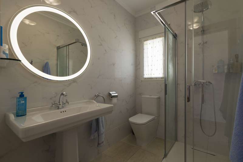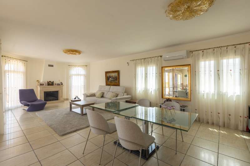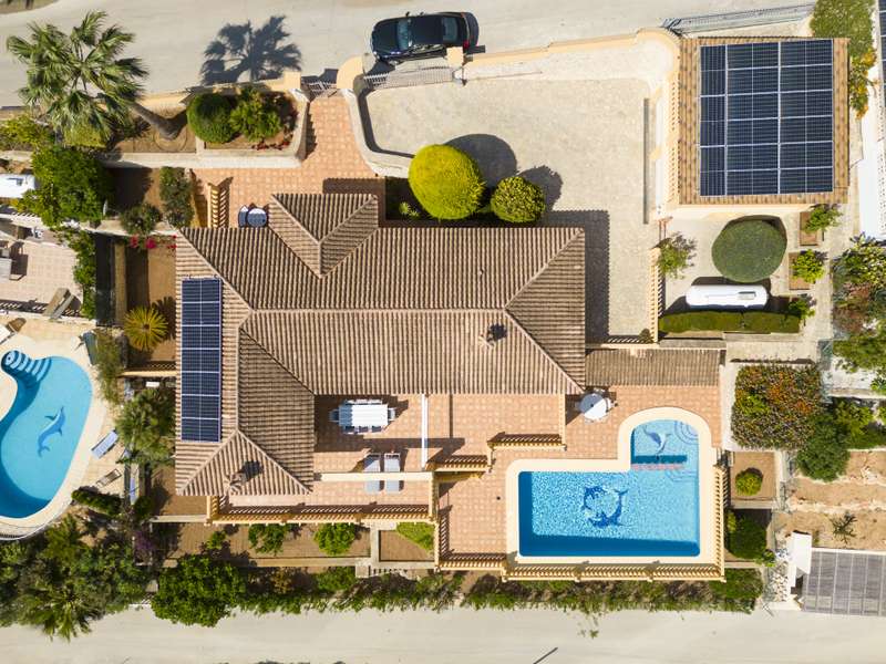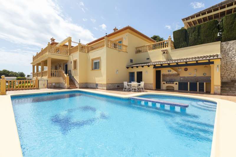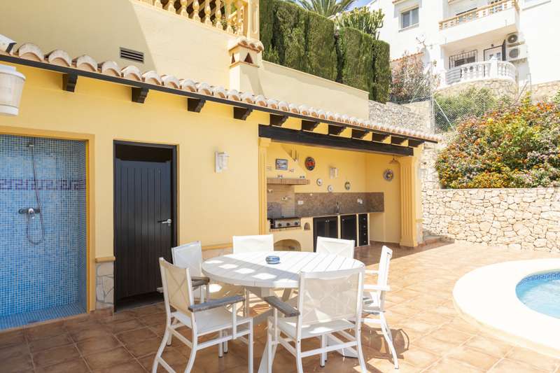 Elegant property with spectacular views of the sea and the island of Portichol in the quiet area of Balcón al Mar in Jávea (Aicante) Spain. The house is distributed on two levels. The main floor consists of a large living room with fireplace, open-plan kitchen equipped with access to a spacious terrace with views of the island of Portichol, guest toilet and the master bedroom with en-suite bathroom. On the ground floor there are 2 double bedrooms with wardrobes, 1 full bathroom, an area for a laundry and storage room and an independent apartment with a living room, an open-plan kitchen and a double bedroom with an en-suite bathroom. From this level there is access to the pool area where there is a spacious barbecue, a toilet and an outdoor shower. It has a garage for 2 cars, a parking area and a garden. It has underfloor heating by heat pump, air conditioning in the bedrooms, solar panel installation, an alarm system and surveillance cameras.