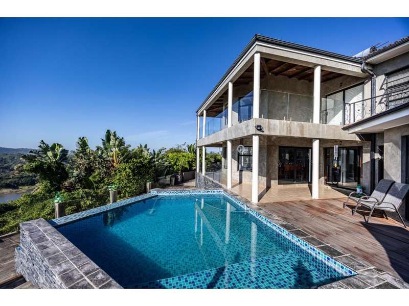 New Release!! - Dual Mandate!! I am privileged to market this Spectacular & Exquisite, Contemporary Balinese Design Home,with Absolute WOW Factor!! It is Well Built and has Breathtaking Views of the enchanting Gonubie River as well as distinctive Sea Views, which are Enhanced with Frame less Stack away doors all around and one way glass ( No curtains needed, and where it is needed there is blinds) It is the Epitome of Style and Luxury with High End, Top Quality Finishes and Open plan living at its best - Perfect to Entertain. It has a Designer Imported kitchen, being any Chef's Dream, with everything that opens and shuts, including a built in coffee machine. Prepare culinary delights, while enjoying the serene ambience with Stunning views and natural light that floods in. The lounge area is designed to maximize the River views too, with the large windows that offer a Panoramic vista. The Dining area is thoughtfully positioned to take advantage of the picturesque poolside setting. This Exceptional ome boasts 6 Generous size bedrooms, with 6 En suite Bathrooms (all with breathtaking views), with all the bedrooms leading out onto balconies, with the Main bedroom, having its own huge big private balcony. Perfect To sit and take in the views. .Each bedroom is designed with Comfort and Elegance in mind, providing a Serene Haven too relax and rejuvenate. The main bedroom includes a luxury En suite and Dressing room. This is a Perfect B & B Opportunity!! . It also has an indoor and outdoor braai area, plus a lovely big fire pit, to sit out and enjoy the evening with friends, taking in the truly magnificent skyline on those cold winter nights, overlooking the pool and Gonubie river. This double-story home holds many unique features throughout, creating a truly unforgettable living space. Family gatherings are made easy through open-plan living. There is nothing lacking with this home from the smallest details to the most obvious features. The pictures speak for themselves, come take a look for yourself. It also has 3 garages, Domestic room and separate Laundry, 2 Solar geysers. The meticulously landscaped grounds provide an oasis of tranquility This home speaks pure elegance. Make it your call today AND at such a Reduced Price!! - You are Getting an Absolute Bargain!! - Come make this your "Dream Home and Happy Place"!!