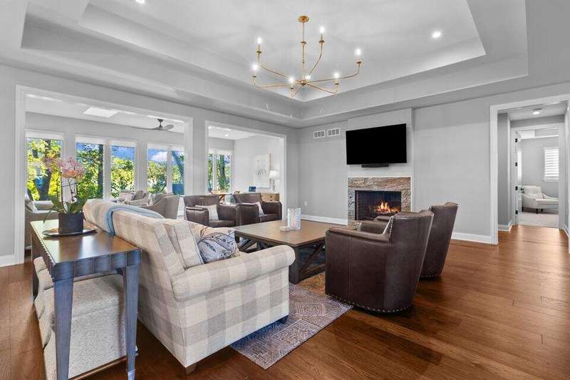 Luxury finishes define this 5-bed, 4.5-bath home in Geneva National. Thoughtfully designed ranch home impresses with its open floor plan and large windows. A gourmet kitchen with upgraded appliances and a large island is perfect for entertaining. The main-level primary suite offers a spacious walk-in closet and spa-like bath. The main level has 2 more en-suite bedrooms. The lower-level walkout is designed for entertaining, with a generous recreation area and custom wet bar. Two Bedrooms and full bath with a freestanding soaking tub creates an ideal guest retreat. Outdoors, enjoy peaceful evenings around the firepit surrounded by lush perennials & mature trees. This meticulously maintained home blends elegance, comfort, and privacy in one of Lake Geneva's most desirable communities.