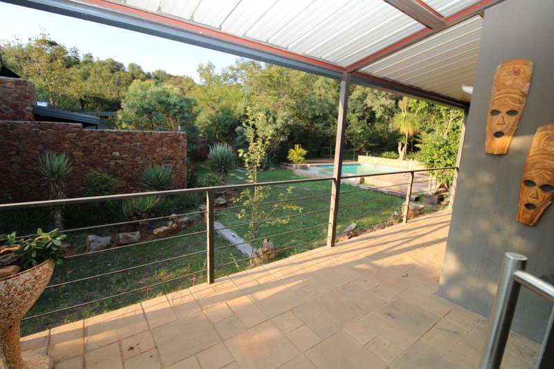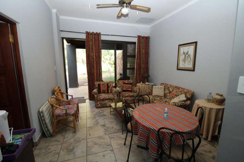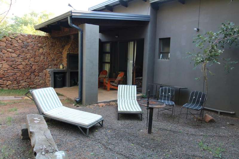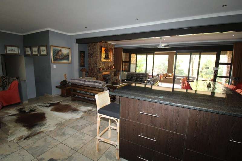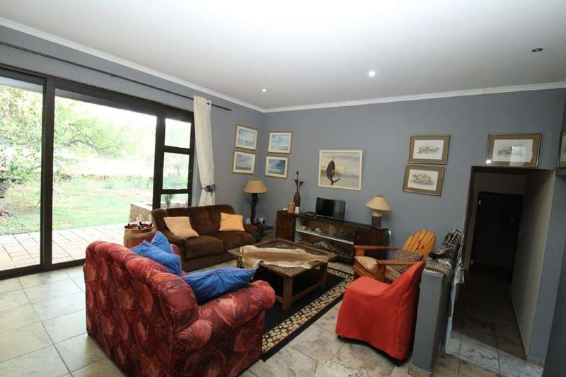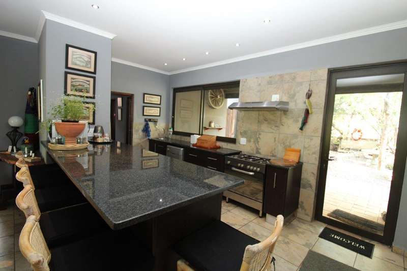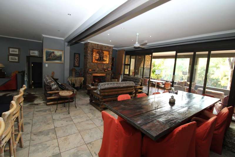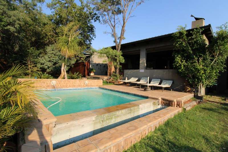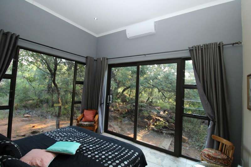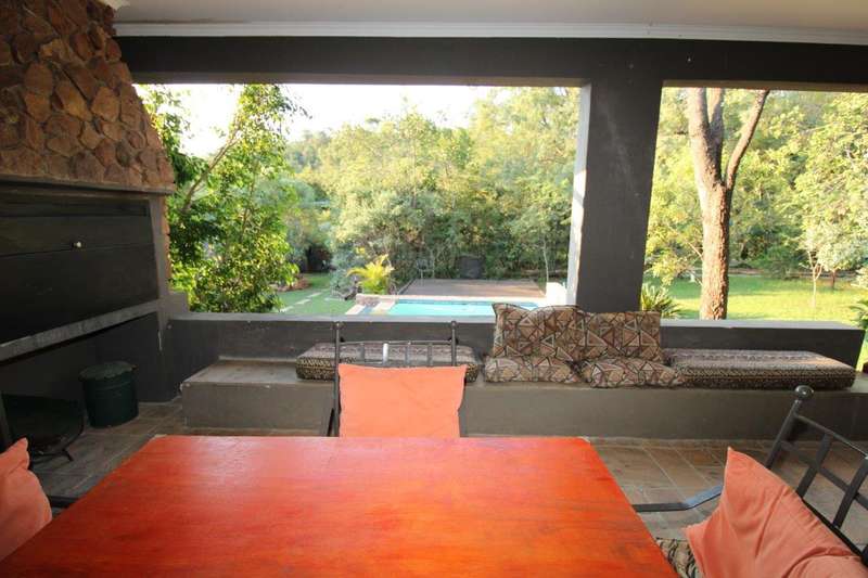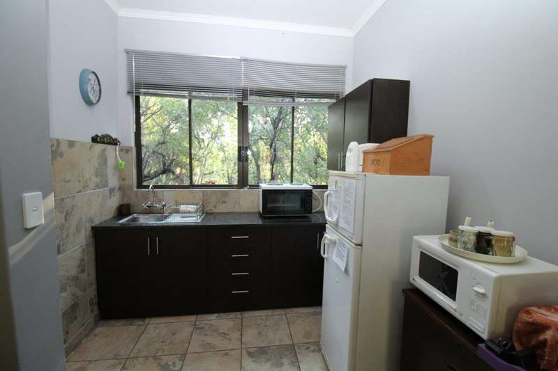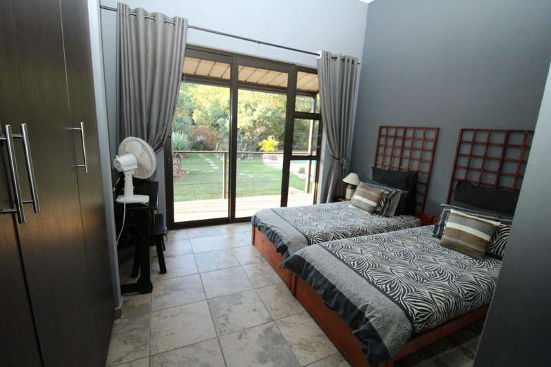 The private lodge consists of a big main house sleeping 6 to 8 people and two identical chalets, each with open plan kitchenette, dining area, lounge, and patio. Each chalet has two en-suite bedrooms. This lodge can house 14 to 16 people in total sharing. Rim flow swimming pool with safety net, sun deck and sun loungers. Boma braai area and patios – Making it ideal for a group of Directors or shared ownership consortium or large family getaway or retired pensioners. Main house: Three en-suite bedrooms, all with sliding doors that open to the garden and pool or some overlooking the natural bush. Main house has a guest toilet with glass door leading to pool area. Fully equipped open plan kitchen, big double door fridge freezer / Alba gas stove with gas oven, dishwasher, and microwave oven as well as all cutlery and crockery. The house has two lounges with a lovely built-in stone built fireplace for winter. Open plan kitchen is a scullery with dry yard equipped with a washing machine and lock-up pantry. The main house also has a private study or could serve as a fourth bedroom. The big sliding doors open onto a big patio with built-in braai on the Northern side overlooking the pool, and a beautiful rock koppie (Hill). On the Southern side another big patio with serving hatch for the boma braai area surrounded by big established indigenous trees. Next to the double undercover garages/carports is a play/ TV room equipped with TV decoder antenna and facility with aerial for Wi Fi and Internet. CHALETS: Two separate self-contained chalets, each with two en-suite bedrooms and open plan lounge with a fireplace and kitchenette (Fully equipped) privately situated, each with own patio and undercover built-in braais. (70m2 each). Caretaker or staff one bedroom flat with bathroom & kitchenette with its own private entrance. The property is to be sold “voetstoots” with all furniture, bedding, and content. Only personal family artefacts will be removed. The property is situated 6km on tar road from the main entrance on the R516 (manned 24/7 by Security) which makes it very safe and private. Tar roads all the way to the lodge with 2 track concrete road for the last 400 metres. EXCLUSIVE Secluded and private high quality Bushveld lodge. The buildings are mostly clad in natural rock and blend in with their surroundings. Full traversing rights of game reserve ideal for road and mountain bike cycling, walking and game drives. Property size: 50m x 50m. (Situated in and surrounded by Zwartkloof Private Game Reserve 2100ha). Game species include Buffalo, Leopard, Giraffe, Sable, Zebra, Nyala, Blue Wildebeest, Roan Antelope, Kudu, Bushbuck, Klipspringer, Impala and many other plains game species. Birding paradise. Buildings total size is 450M2. GREEN DESIGN: The house was built with the idea of being as “green” as possible with low maintenance. The main house and cottages have solar equipped geysers but with electric backup for rainy days. Gas stove installed plus 3 x 2500l rainwater tanks to collect rain water equipped with a pressure pump. The main Zwartkloof water supply for the dwellings is equipped with a water softener /purifier. As well as a generator for power outages. Beautiful low maintenance garden with daisy lawn- ever green (No lawnmowers) has well-established natural big trees, aloes, cycads, pelindaba rock and railway sleepers. Lots of interesting artefacts. Riverine area in front of property with small non Perennial River that flows in rainy seasons. Main Pool area fenced off to protect the lovely garden from wild animals. Zwartkloof Private Game Reserve Overview Zwartkloof Private Game Reserve is situated 13 km west of Bela-Bela (Warmbaths) on the R516 leading to Mabalingwe and only 90 minutes from Pretoria. The Zwartkloof Private Game Reserve Homeowners association side of the farm is 2031 ha in extent. The total farm including Zwartkloof Adventures is more the 3000 ha. This peaceful & authentic development is the ideal place to work from home or retire and live in harmony with nature. Tar roads to each stand sets this development apart from other private game reserves of similar size. All stands have spectacular views of the mountains and bushveld. The developer considered personal privacy, visual disturbance and minimum noise pollution as key priorities when positioning the stands. The size of the stands, 2500 square meters, have been deliberately chosen to limit the impact on the natural environment. To add to the quality of the development, all buildings conform to contemporary architectural guidelines. This, however, still allow for personal preferences regarding the design. Apart from a gatehouse with facilities for guards we also have a communal complex housing the administrative office, swimming pool, play area, picnic spots and tennis court. All the above will ensure a highly accessible, low-density, ecologically sensitive development of exceptional quality. Homeowners gain secure access through state of the art RFID and number plate recognition systems. Game species include blue wildebeest, zebra, buffalo, bushbuck, baboon, duiker, giraffe, mountain reedbuck, impala, klipspringer, kudu, leopard, nyala, roan antelope, sable antelope, steenbok, waterbuck, warthog, and leopard. Game drives available with Zwartkloof Adventures to view rhino, lion, tiger, leopard, wild dog, hyena, caracal, and other predators.