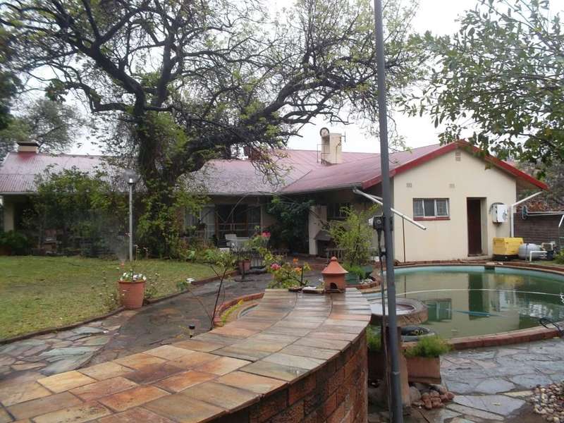 AN ABSOLUTE VALUE FOR MONEY!! This property is a nature lover's dream. The low-maintenance garden is well-maintained with attractive trees. This beautiful house is built on a 4481 square meter stand. The house has a lounge with a spacious dining/TV room and a built-in fireplace. The ample kitchen leads into a laundry/scullery. A staircase from the entrance leads to an upper level to the five bedrooms and a study with built-in shelves. The main bedroom walks out on a veranda/balcony and has an en-suite bathroom. The second bathroom has a bath, basin, and toilet. There is also a separate shower. All the rooms have built-in cupboards all the windows in the house have burglar bars. A second staircase leads to the lower level to an open-plan bedroom/living area with its own entrance and a full bathroom. Double lock-up garage with double carport. Outside store room. Servant's bathroom There are two water tanks with an automatic pump for backup water - 5000 liter and 2500 liter. Fibre Glass swimming pool. Open braai area. Generator included. At the back of the property, there is a one-bedroom flat with a bathroom and kitchen, which is currently been rented out for an additional income. About one-third of this stand has not been built on and is ideal for further development.