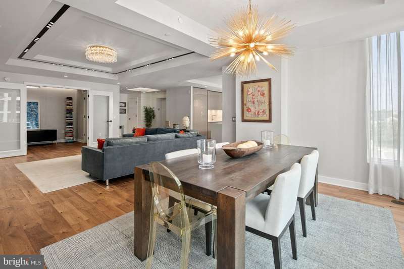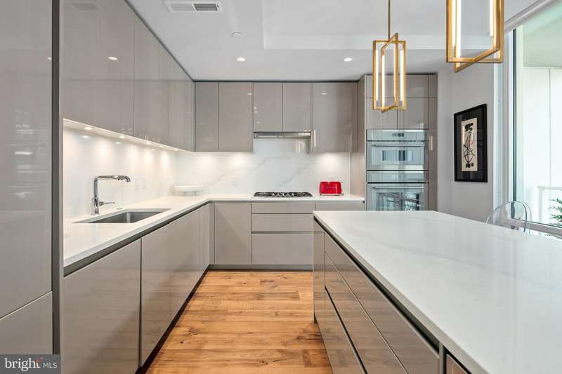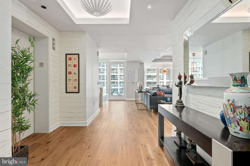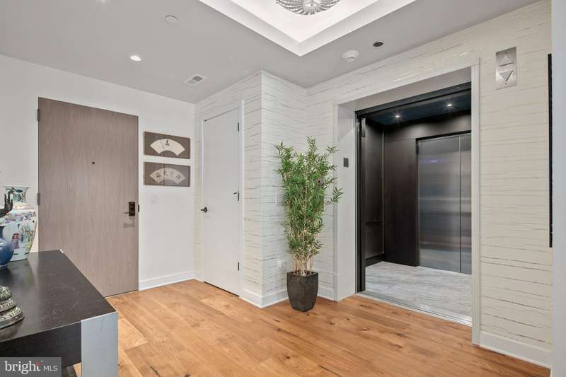 WHAT MAKES THIS UNIT STAND OUT? A private elevator opens to beautifully appointed rooms, wrapped in floor-to-ceiling windows, enhanced with high ceilings and exceptional finishes. Luxurious features include hand-scraped hickory floors throughout, Thermador appliances, Snaidero Italian cabinets, marble tile, heated bathroom floors, and high-efficiency heating and cooling systems. A separate laundry and storage room, private EV car charging at your adjacent parking spots (N224, N225 on P2), and a convenient private storage unit bring the comforts of a single-family home to condo living. The current owner has enhanced the spacious den with glass french doors to add natural light and improve function.