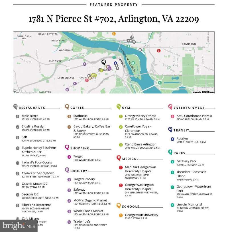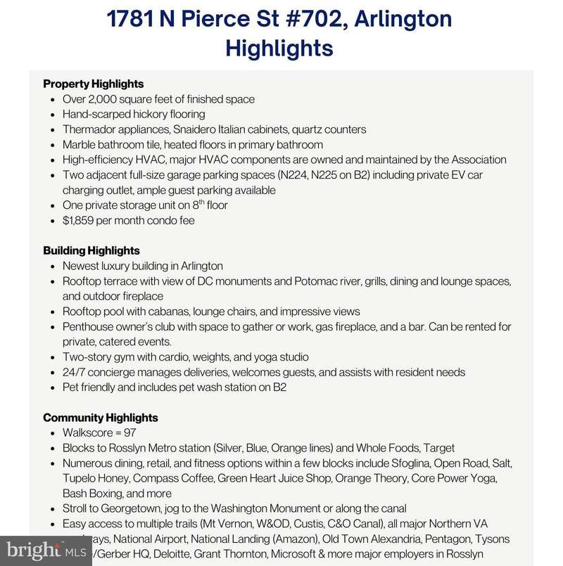 WHAT MAKES THIS LOCATION STAND OUT? Walk Score = 97! Blocks to Rosslyn Metro (Silver, Orange, and Blue lines). Numerous dining, retail, and fitness options within a few blocks include Sfoglina, Open Road, Salt, Barely Mac, Tupelo Honey, Compass Coffee, Green Heart Juice Shop, Orange Theory, Core Power Yoga, Bash Boxing, and more. Stroll to Georgetown, jog to the Washington Monument or along the canal, and walk to Whole Foods or Target! Easy access to multiple trails, all major Northern VA roadways, National Airport, National Landing (Amazon), Pentagon, Tysons, and more! Nestle/Gerber HQ, Deloitte, Grant Thornton, Microsoft, & more major employers in Rosslyn.