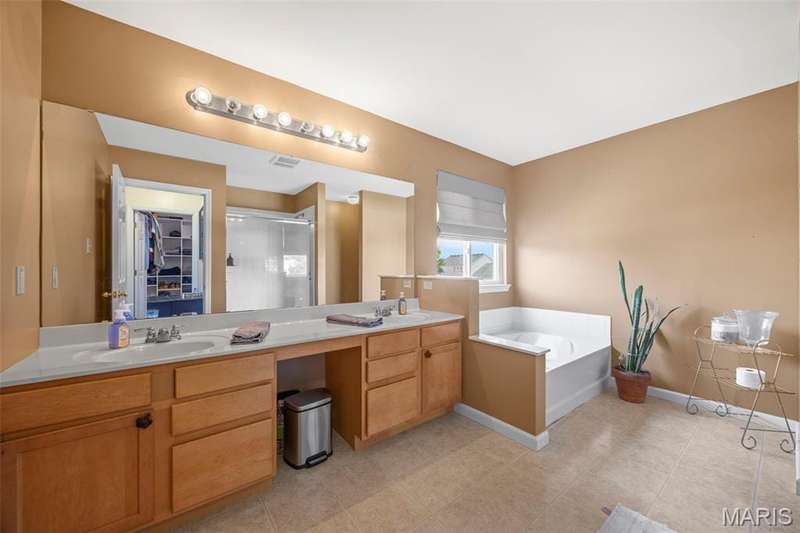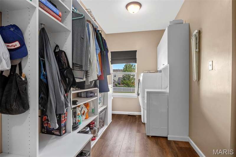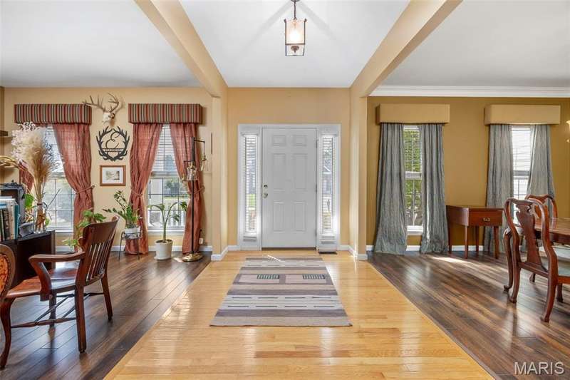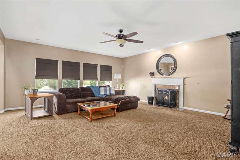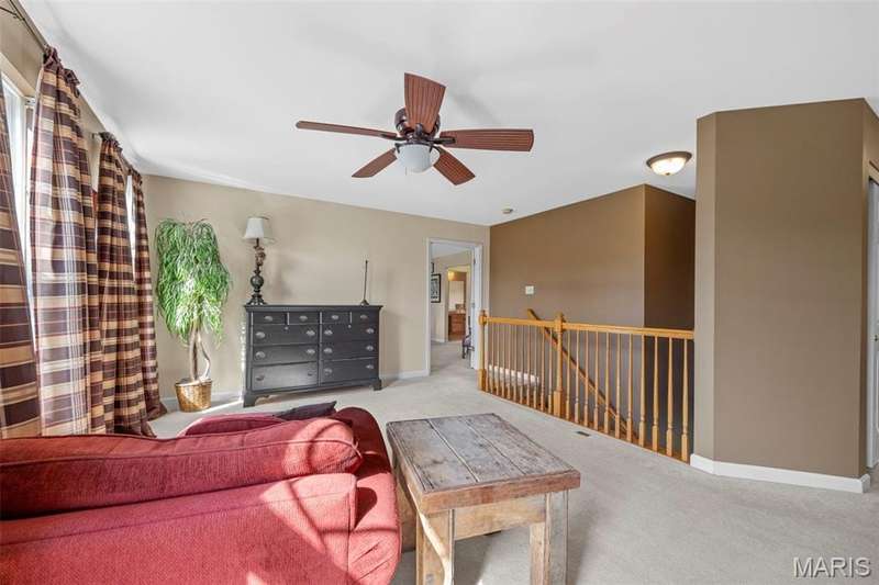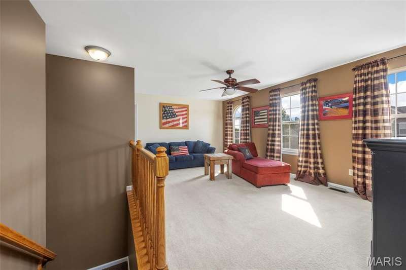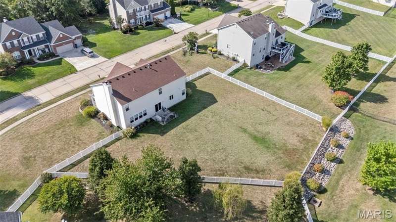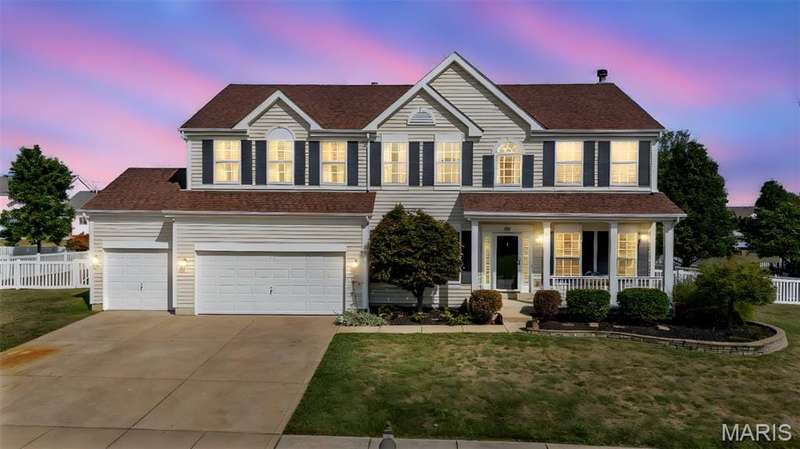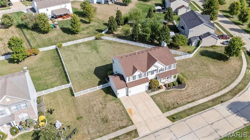 Beautiful 2-story home with over 3,000 sq ft of living space on nearly a -acre lot, tucked at the end of a quiet cul-de-sac in the highly rated Wentzville School District. The fenced backyard with crisp white vinyl fencing offers privacy and plenty of room to relax or entertain. Inside, a welcoming wood foyer opens to a formal dining room and a flexible living room or home office. The open-concept great room features a cozy wood-burning fireplace and flows into the kitchen and breakfast area. The kitchen includes 42 maple cabinets, a farmhouse sink, butterfly island, laminate counters, and a walk-in pantry. Main-level laundry offers built-in cubbies, cabinets, and newer flooring. The insulated and drywalled 3-car garage provides ample storage. Upstairs, a loft area separates the spacious primary suite from three additional bedrooms. The primary retreat features a sitting area, dual sinks, soaking tub, separate shower, and walk-in closet with built-ins. The full basement includes a bath rough-in and egress window for easy future finishing.