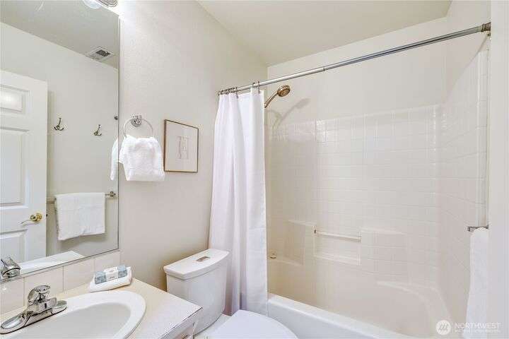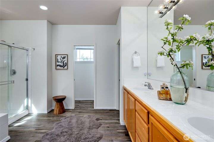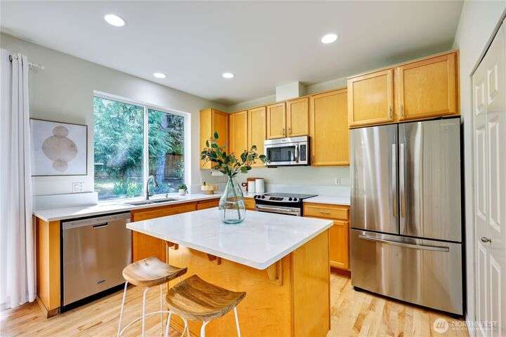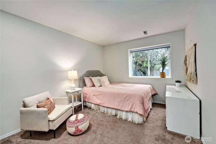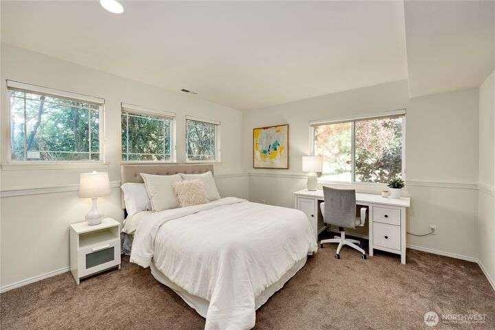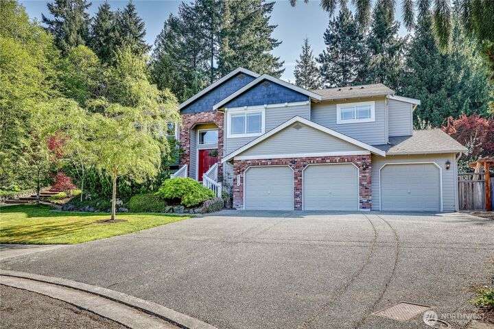 Located in the sought-after Commodore West neighborhood, this home boasts a close proximity to town, ferry and shopping. Large windows, vaulted ceilings, and skylights flood the home with natural light. A living room, family room, dining room, kitchen, and a large primary ensuite with 5-piece bath complete the main floor. The sizable fully-fenced back yard, with hot tub, sits off the kitchen. New quartz countertops grace the kitchen and office alcove. A/C. New interior & exterior paint. Lower level has 3 additional bedrooms, or use the largest as a bonus room/den with slider to backyard. Access to 3-car garage and utility room on lower level as well. In-town convenience meets sizable lot, at a great price. Tour and make this yours today!