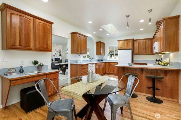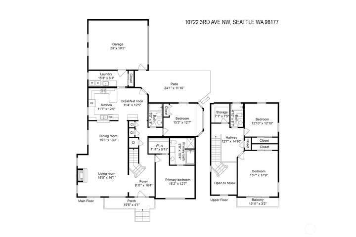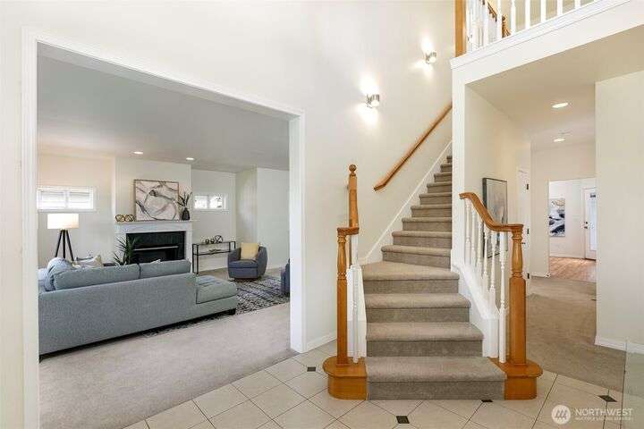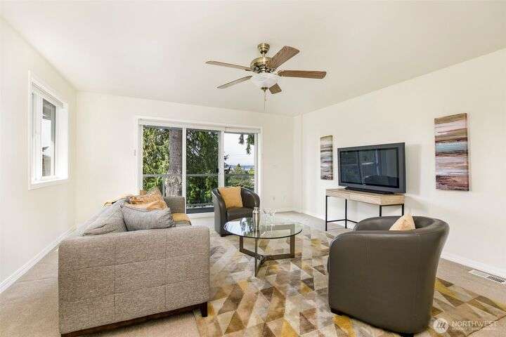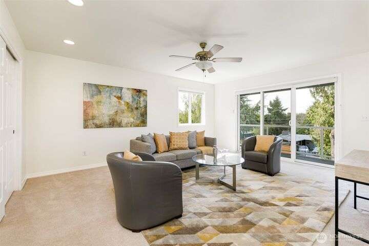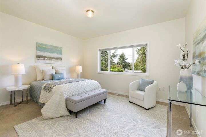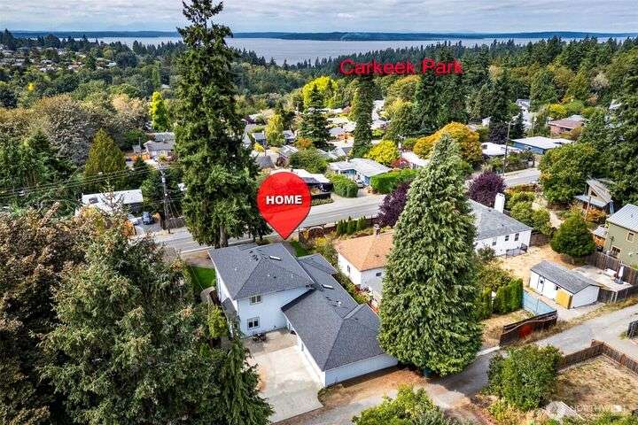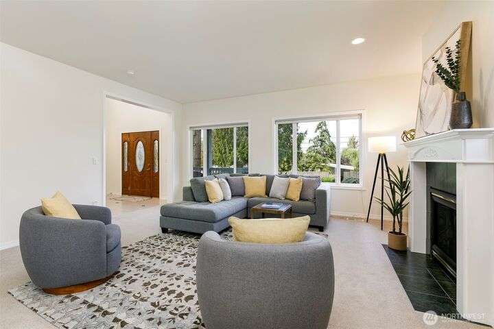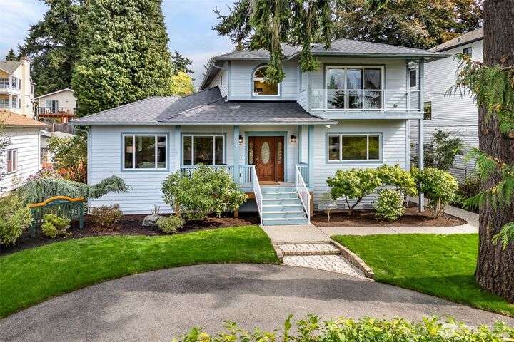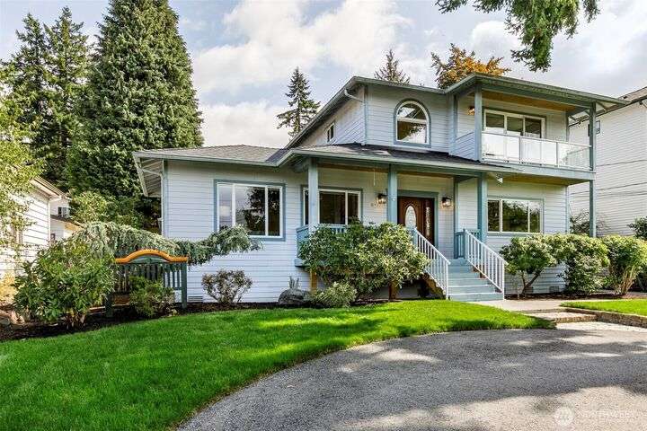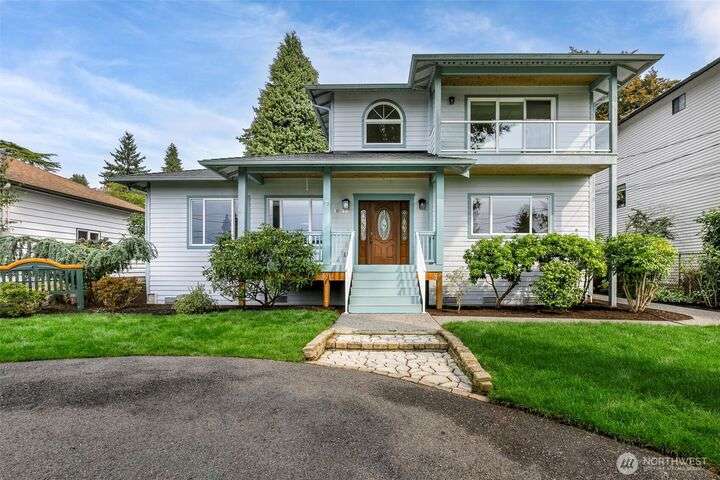 Beautifully maintained Northwest Seattle home offering comfort, flexibility, and timeless appeal. Mature landscaping and a circular drive create a welcoming first impression with extra parking for guests. Inside, the dramatic two-story entry opens to sunlit living and dining areas anchored by a cozy gas fireplace. The kitchen features abundant cabinetry and counter space, plus a cheerful nook with access to a private patio and oversized two-car garage. The main-floor primary suite includes a walk-in closet and spa-like bath, plus a second bedroom and full bath. Upstairs offers a loft, bedroom, and a fourth bedroom or bonus room with balcony, full bath, and storage. Prime location near Carkeek Park, Greenwood, shops, dining, and transit.