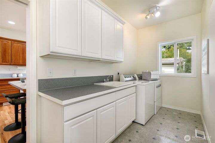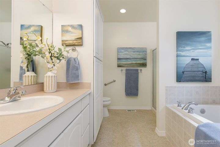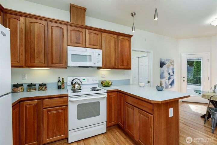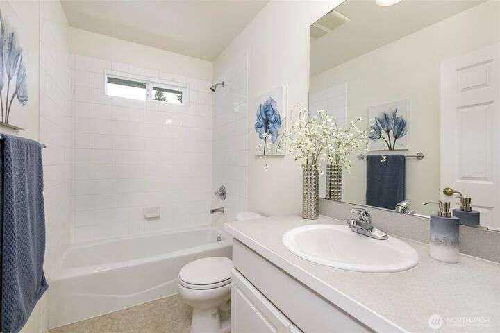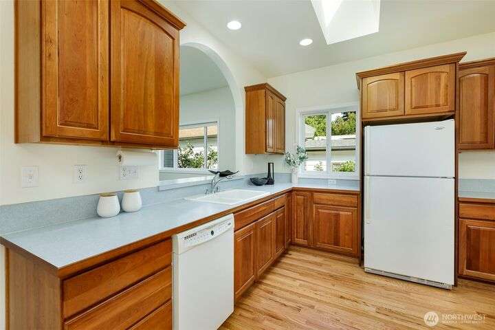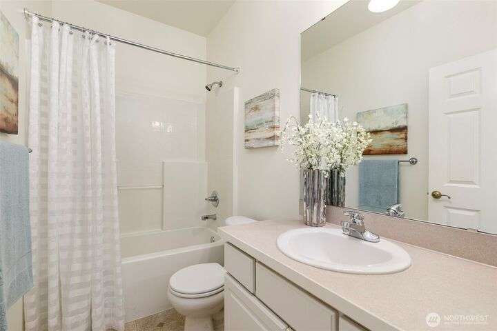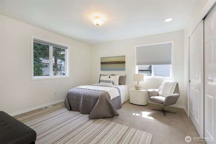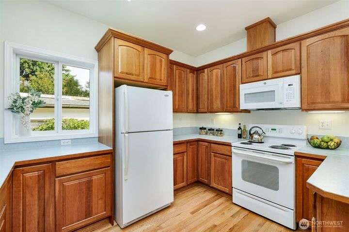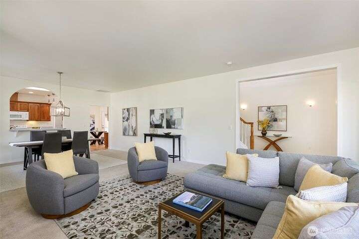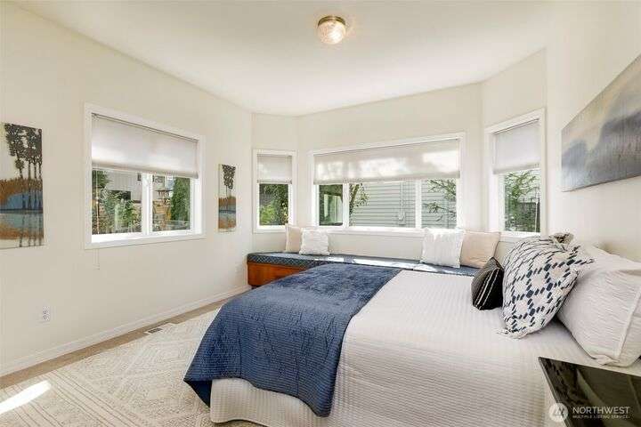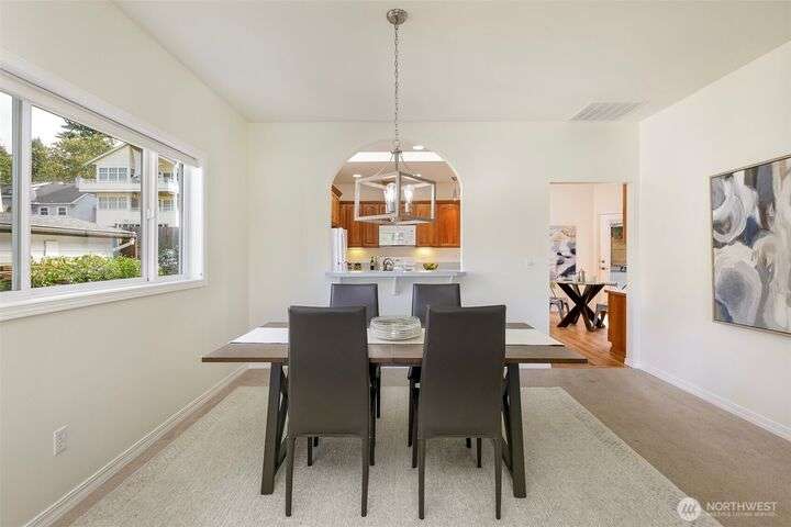 Beautifully maintained Northwest Seattle home offering comfort, flexibility, and timeless appeal. Mature landscaping and a circular drive create a welcoming first impression with extra parking for guests. Inside, the dramatic two-story entry opens to sunlit living and dining areas anchored by a cozy gas fireplace. The kitchen features abundant cabinetry and counter space, plus a cheerful nook with access to a private patio and oversized two-car garage. The main-floor primary suite includes a walk-in closet and spa-like bath, plus a second bedroom and full bath. Upstairs offers a loft, bedroom, and a fourth bedroom or bonus room with balcony, full bath, and storage. Prime location near Carkeek Park, Greenwood, shops, dining, and transit.