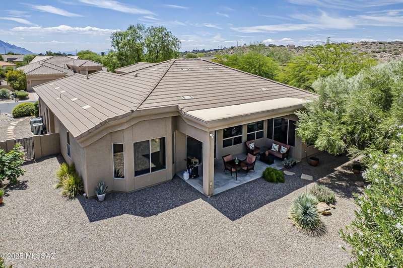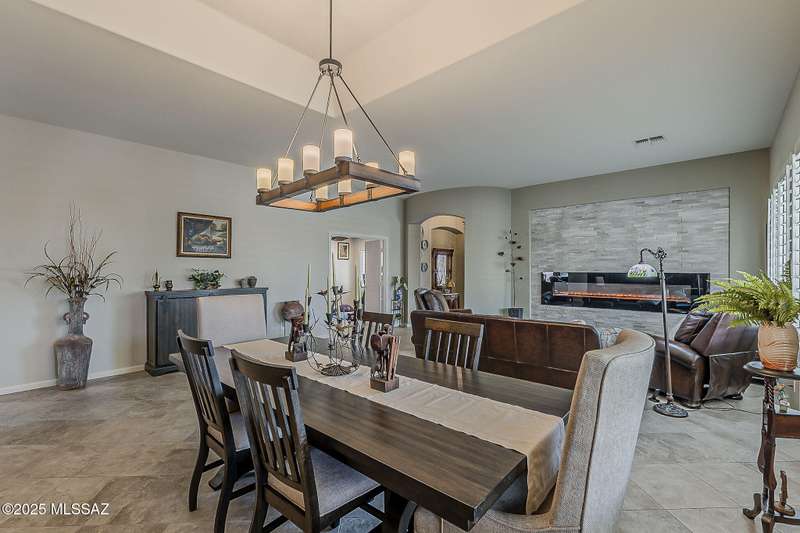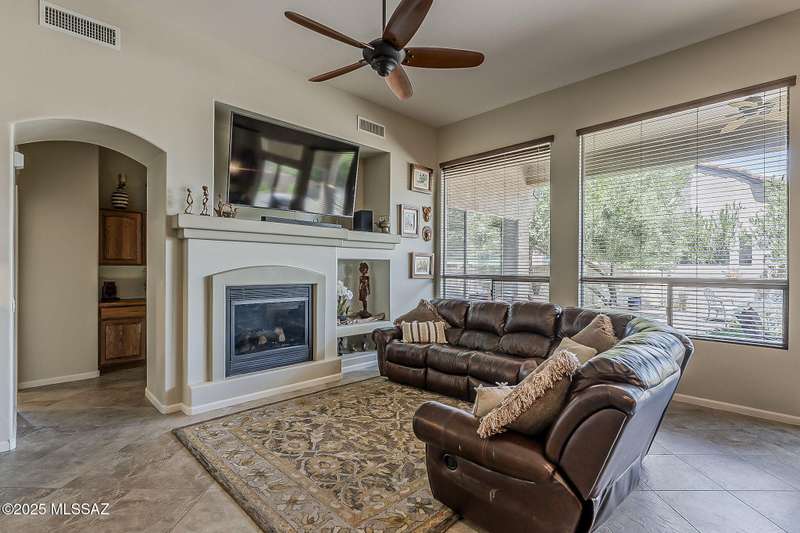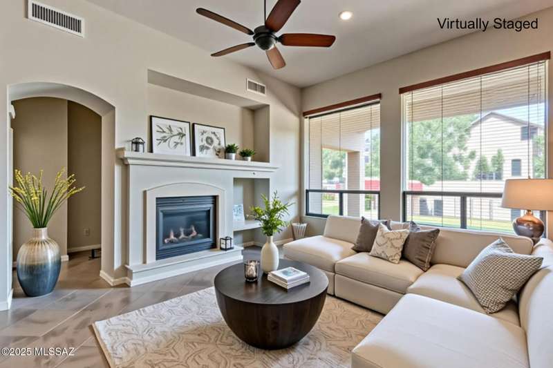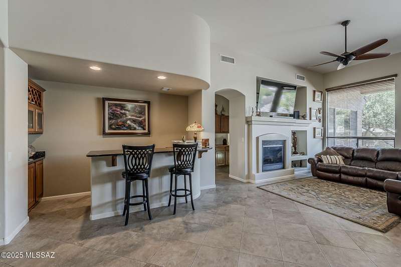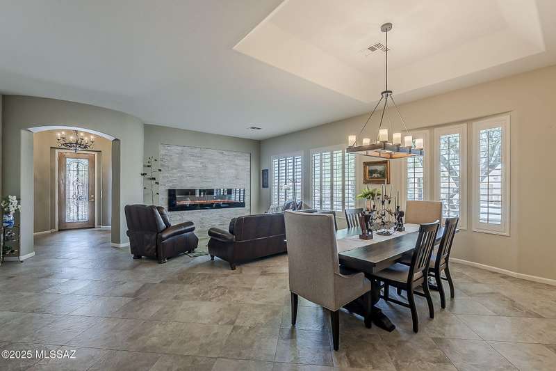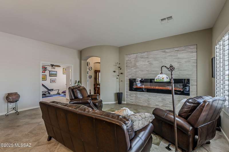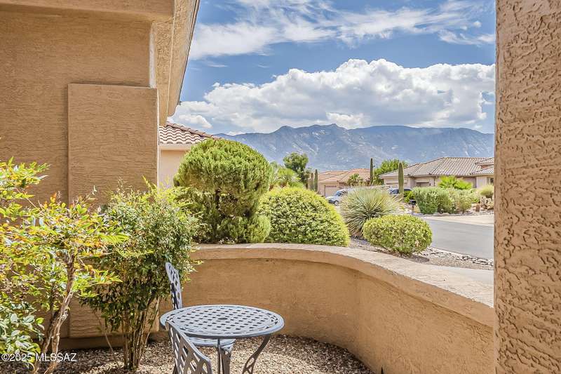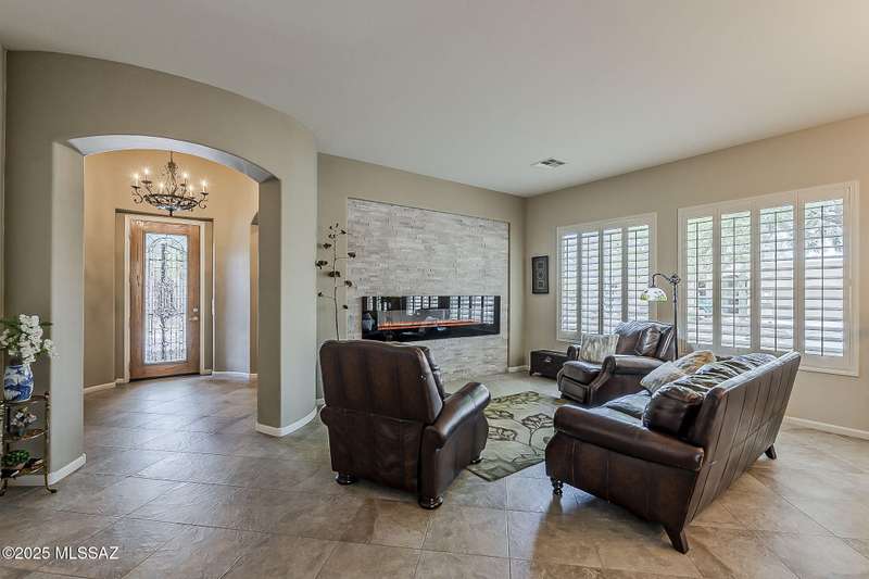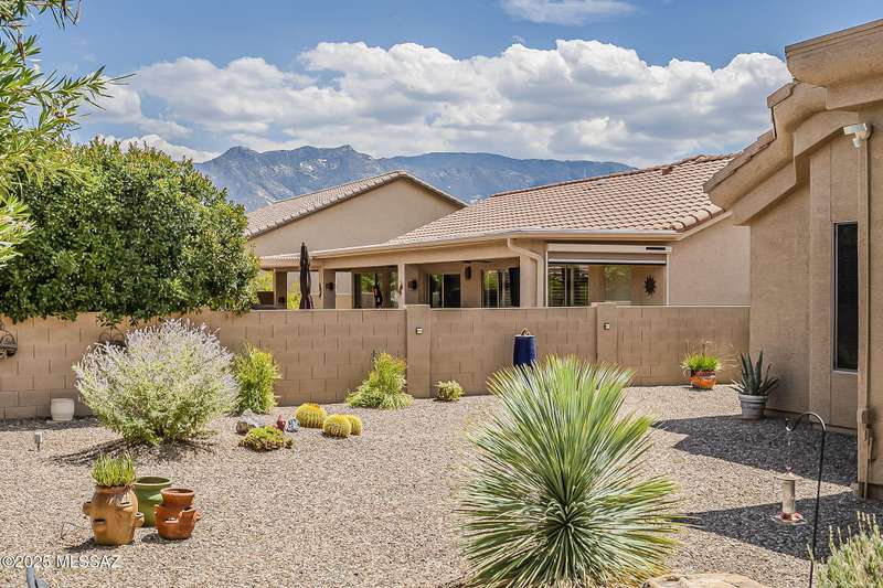 Large quiet corner lot w/private yard, side mtn views, CHEYENNE model offers space, style, and flexibility. Gated front entry w/fountain welcomes you. Bonus fitness room - CONVERTIBLE to GOLF GARAGE with seller credit. Entertainer's kitchen shines with GE Cafe(c) SS appliances, quartz counters, island, wet bar, and open to family room w/gas fireplace and options for TV location. A contemporary stacked rock wall w/electric fireplace highlights the living room. The primary suite features dual closets, dual vanities, soaking tub, walk-in shower, & spacious bedroom. Split floor plan includes 2 guest rooms plus bathroom. Office/den at the front of house. Extended garage w/cabinets, large laundry, powder room, 18'' tile flooring thru living space, and carpet in bedrooms complete this gem.
