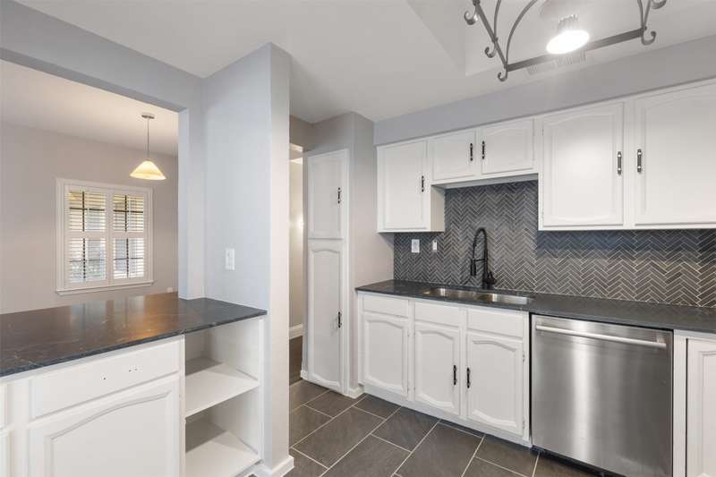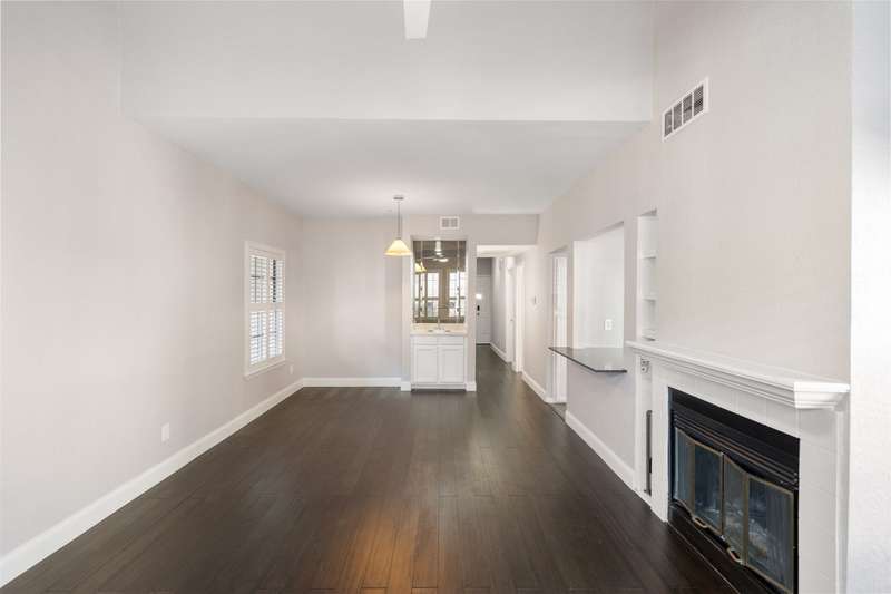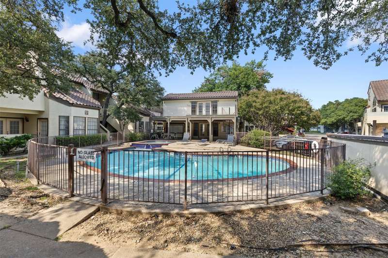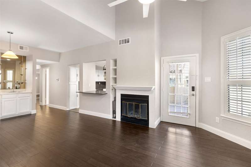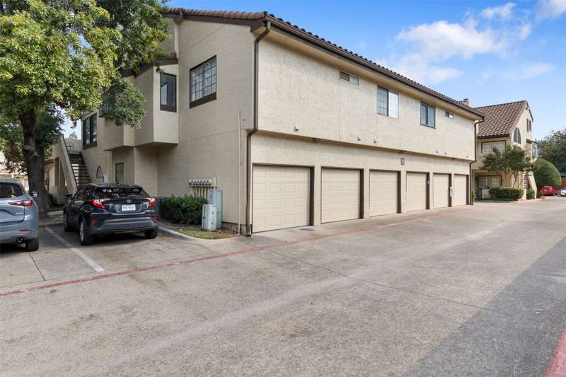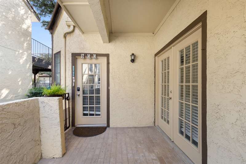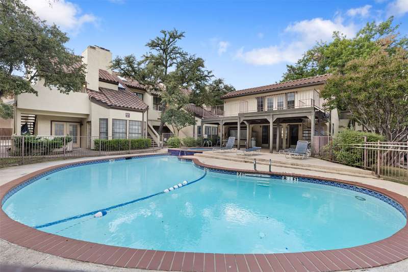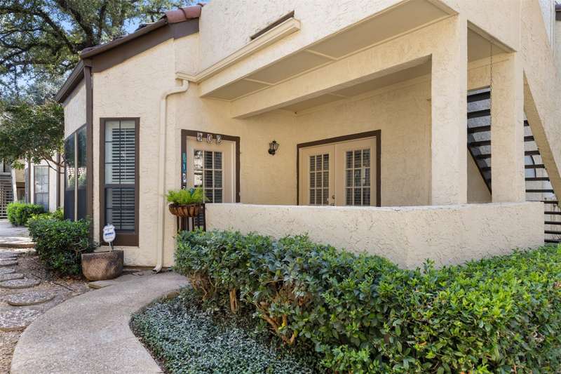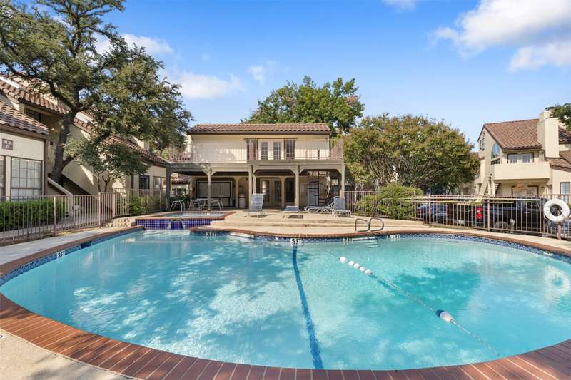 This Mediterranean-style condo in Dallas features 2 bedrooms and 2 full bathrooms. The renovated single-level, first-floor unit is move-in ready and it offers a lock-and-leave lifestyle. The open floorplan flows easily for modern living. Beautiful French doors lead from your kitchen to your covered patio for all day enjoyment. You'll love having the wood-burning fireplace, vaulted ceiling, plantation shutters, sleek dark bamboo floors and new tile in the remodeled kitchen with new quartz counter top. Add on a private covered patio and an attached one-car garage, you will love this home! The spacious primary bedroom has a gorgeous ensuite renovated bathroom and the second bedroom has an updated bathroom as well! Also, the hallway closet has hookups for a full-sized washer and dryer. Enjoy the community pool and hot tub without the worries of maintaining them! Conveniently located near the LBJ Freeway and the Tollway.