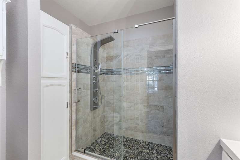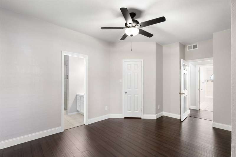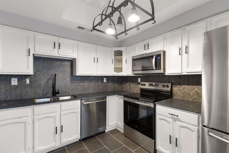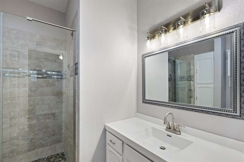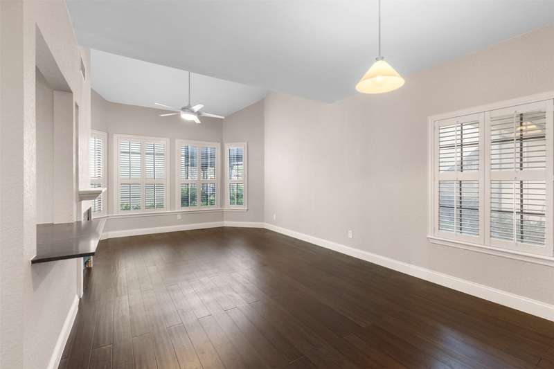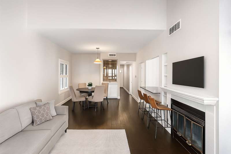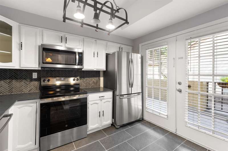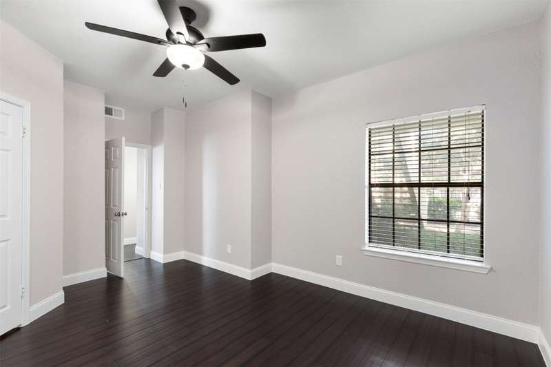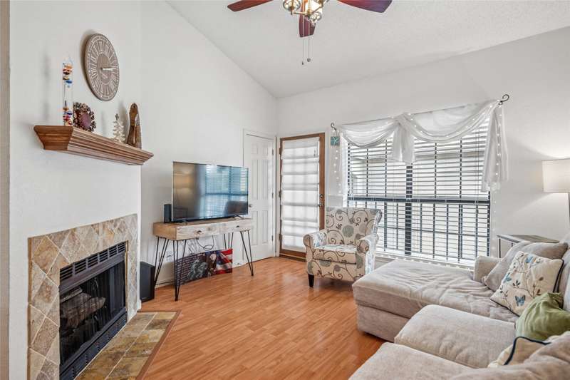 This Mediterranean-style condo in Dallas features 2 bedrooms and 2 full bathrooms. The renovated single-level, first-floor unit is move-in ready and it offers a lock-and-leave lifestyle. The open floorplan flows easily for modern living. Beautiful French doors lead from your kitchen to your covered patio for all day enjoyment. You'll love having the wood-burning fireplace, vaulted ceiling, plantation shutters, sleek dark bamboo floors and new tile in the remodeled kitchen with new quartz counter top. Add on a private covered patio and an attached one-car garage, you will love this home! The spacious primary bedroom has a gorgeous ensuite renovated bathroom and the second bedroom has an updated bathroom as well! Also, the hallway closet has hookups for a full-sized washer and dryer. Enjoy the community pool and hot tub without the worries of maintaining them! Conveniently located near the LBJ Freeway and the Tollway.
