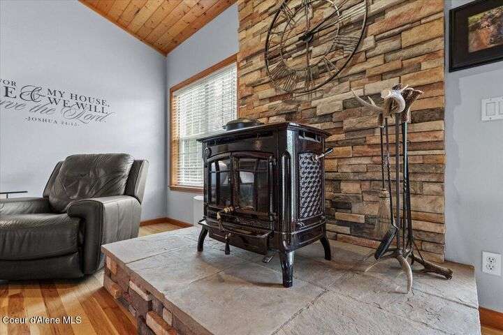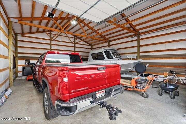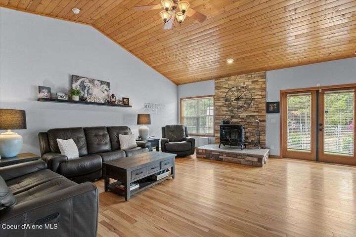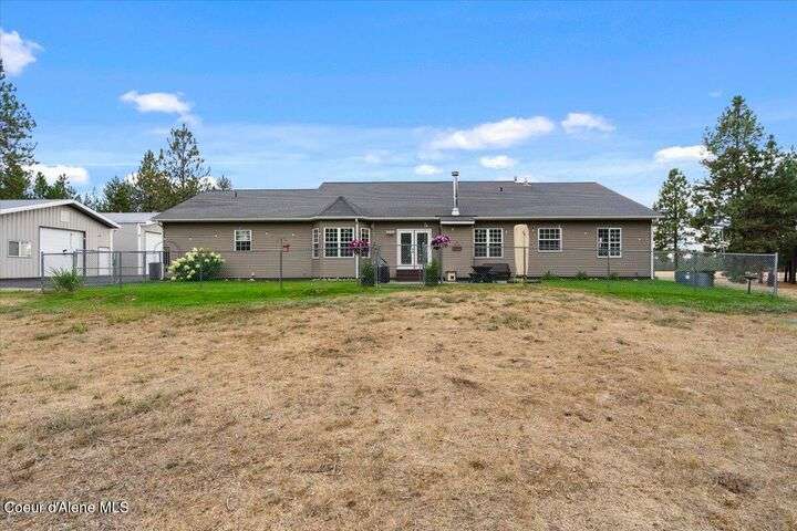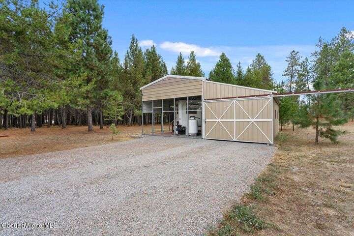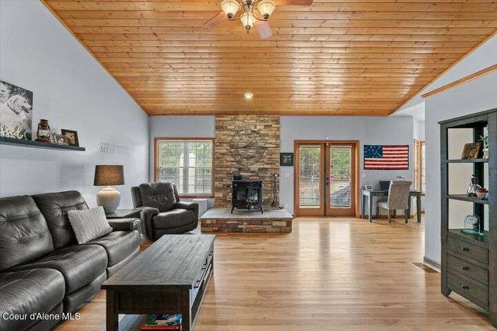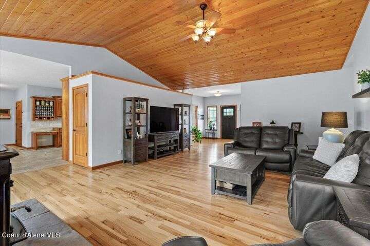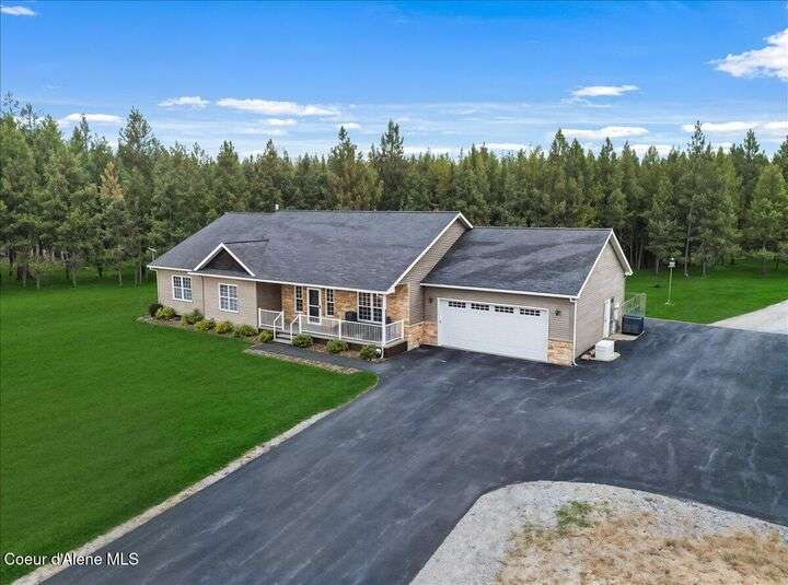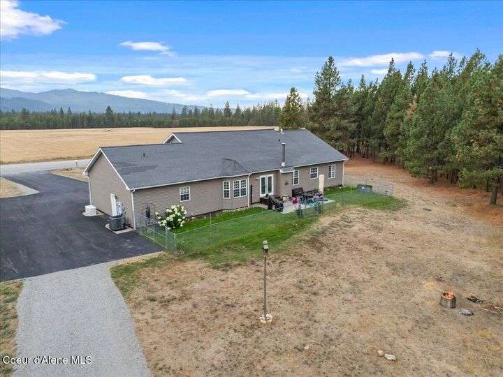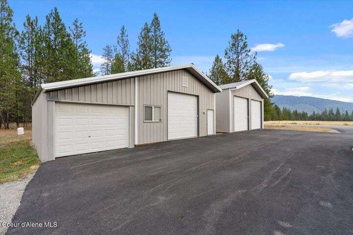 Custom Home with 2 Shops & Stunning Mountain Views across a field where wildlife roam! Enjoy main floor living with an open-concept design featuring a spacious great room with cozy stove and knotty pine ceiling. Hickory hardwood floors, cherrywood kitchen cabinets, and granite surfaces throughout highlight the craftsmanship and warmth of the interior. Main level sits on a daylight basement with an office, family room, bedroom and storage. The property is fully equipped for both work and play with two large insulated shops, each with concrete floors and automatic doors. In back, you'll find an RV-sized carport with attached storage building.. Utility features are equally impressive: 400-amp service, an automatic-start generator, and a 40 gpm well with a 3,000-gallon holding tank. Conveniently located near the new Super One, Farragut State Park, Lake Pend Oreille, and Silverwood Theme Park. This well-maintained property is filled with extras you won't want to miss.