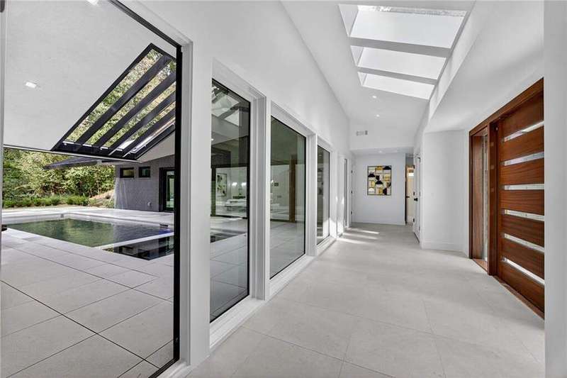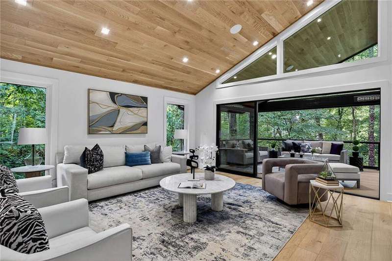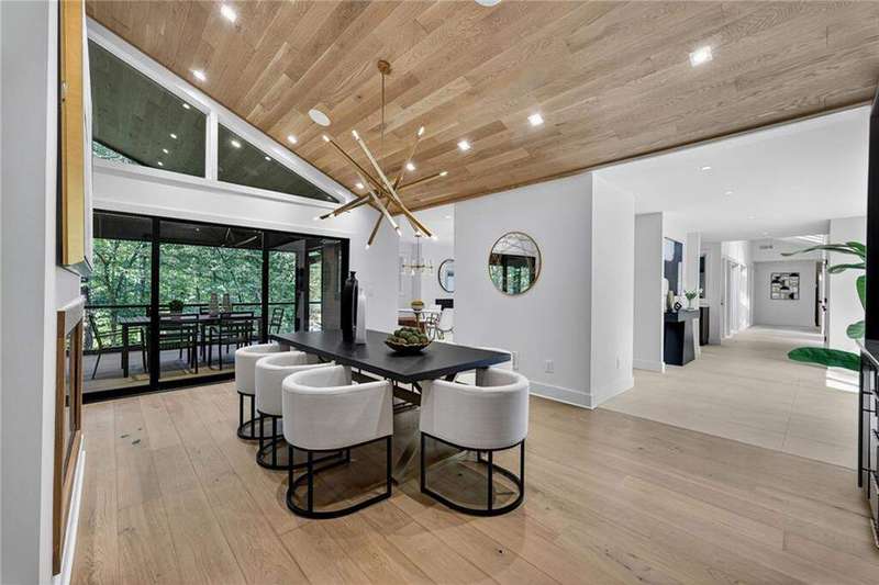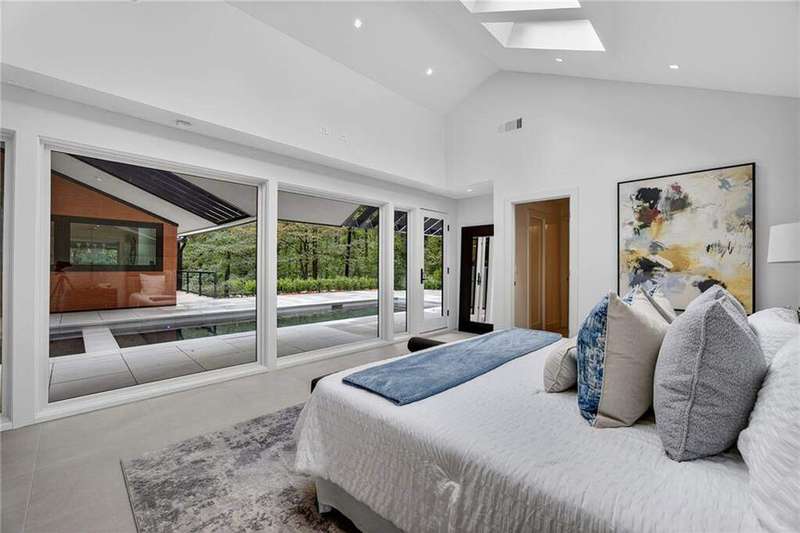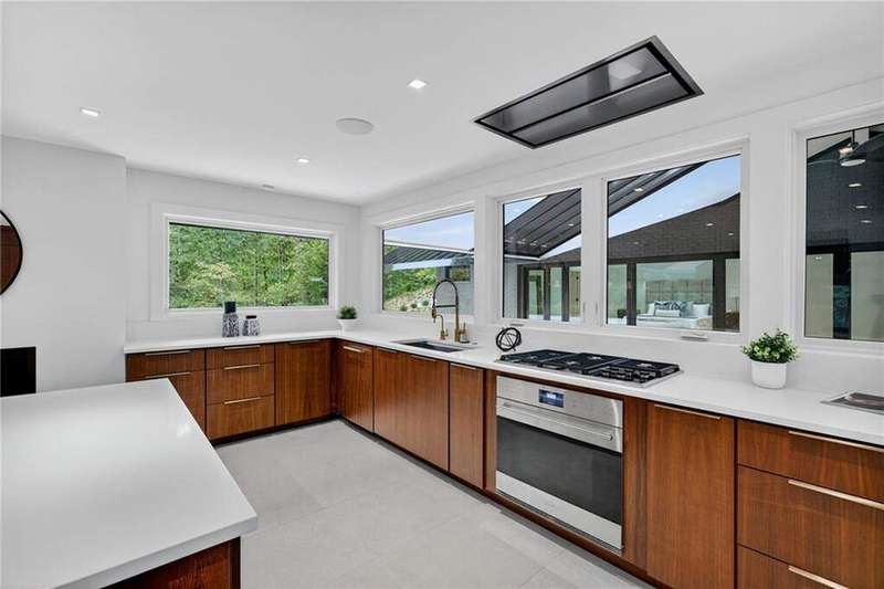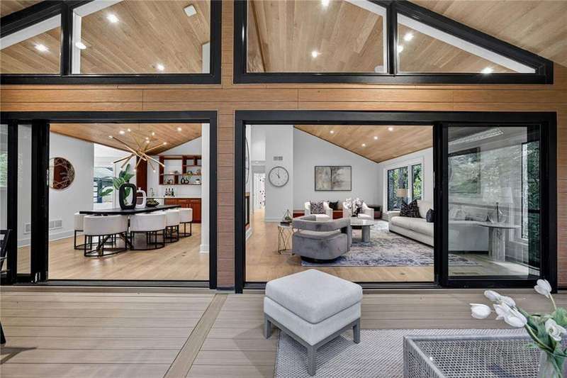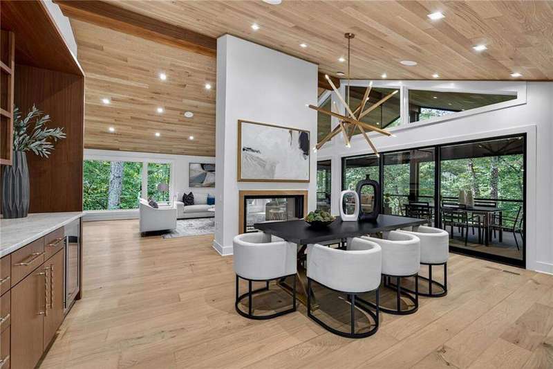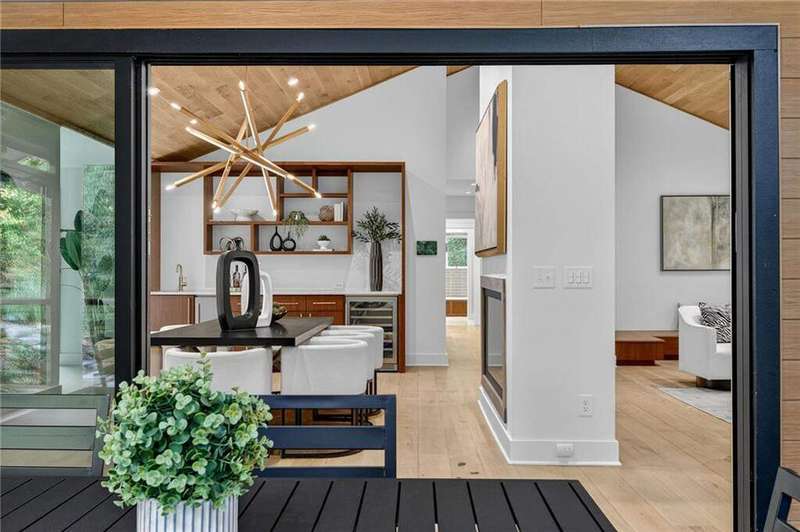 One-of-a-kind modern retreat on just under 2 acres acres with a walk out pool and waterfall views. Designed by Bryan Russell of Dencity, this mid-century-inspired home features a brand-new main level with 14' white oak ceilings, heated porcelain floors in bathrooms, and 30' glass doors opening to a screened deck overlooking the waterfall. Chef's kitchen with top appliances, large island, banquet seating, and walk-in pantry. Primary suite on main with dual spa baths, steam shower, and freestanding tub. Second main-level suite for guests. Resort-style saltwater pool and spa with retractable cover sit at the heart of the home. Whole-house smart automation for lighting, audio, security, and shades plus dual Kohler generators. Terrace level with the most fun custom tiki bar, theater, office, safe room, and walkout to stone patio. Professionally landscaped. A true architectural gem blending modern luxury with natural tranquility. Entertainer's dream home!