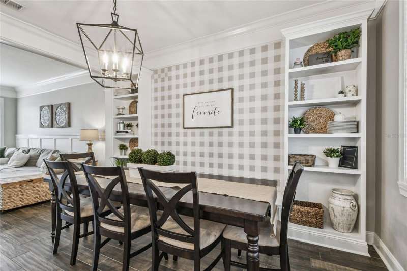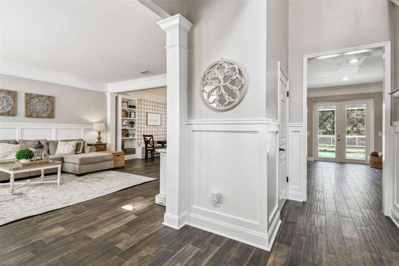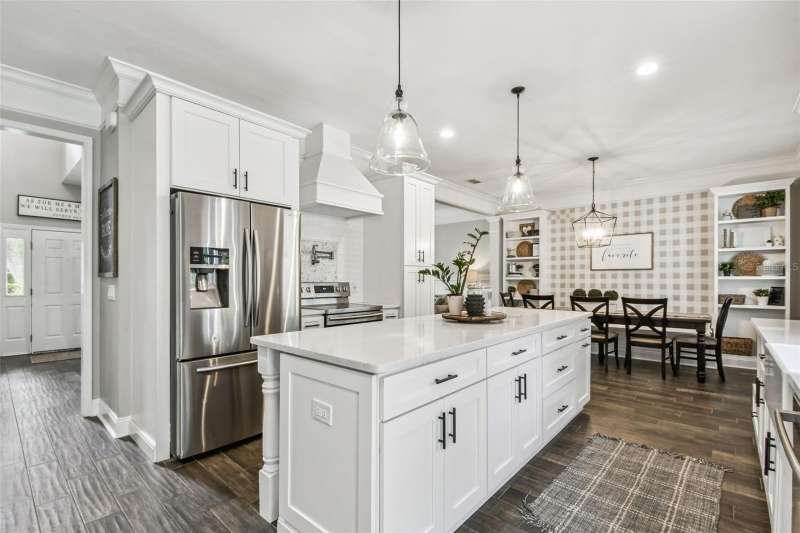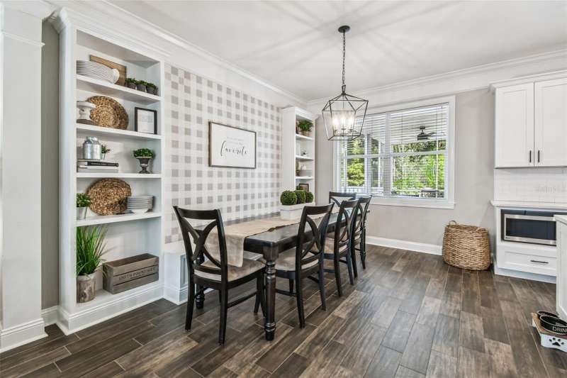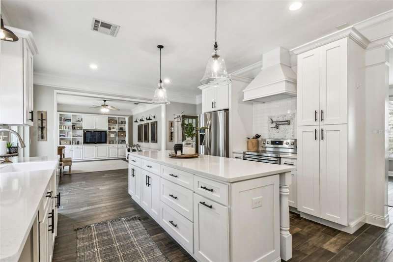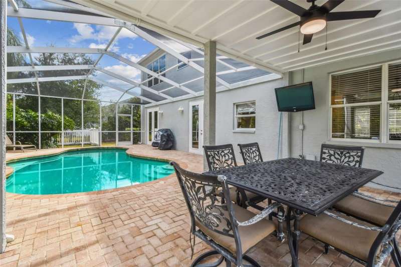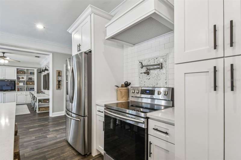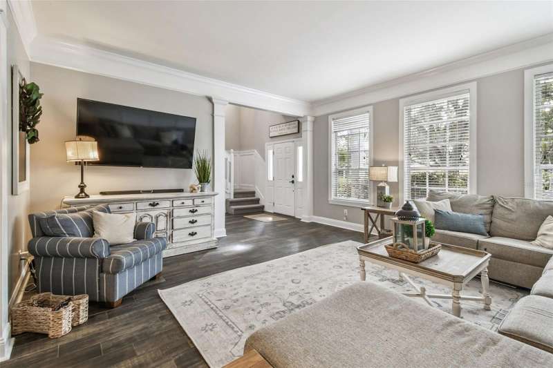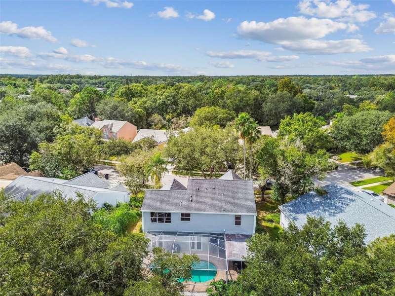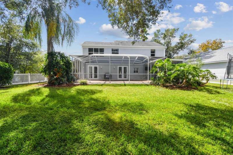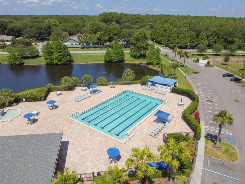 Under contract-accepting backup offers. Beautiful four bedroom, two and a half bath pool home on a stunning pond and wooded homesite in popular Wellington in Tampa Palms. Sophistication and luxury throughout. Over 2300 square feet of living space. NEW AC in 2025, freshly painted inside and out. Pavered entry leads to a large living room. Plank-style tile throughout the first floor starting in the foyer and extending to the living room, dining room, family room, kitchen and half bathroom. The renovated kitchen includes granite countertops, shaker-style white cabinetry with crown molding, a ceramic farmer’s sink with one-touch faucet, subway tile backsplash, vented hood system, pot filler, smooth top range, stainless steel French door refrigerator, microwave, and Bosch dishwasher, as well as a large center island that’s perfect for casual dining. The primary bedroom suite includes an 18x16 bedroom, a large walk-in closet, and a bathroom with double vanity, garden tub, walk-in shower, private water closet, and linen closet. Other upgrades include crown molding, 5 ¼ inch baseboards, wainscoting, custom built-ins in the family room and the dining room, a drop zone as you enter from the garage, two additional storage closets (Can’t have enough storage.), fenced yard and more. Roof is only 9 years old. Sit out on the pavered lanai overlooking the sparkling pool and enjoy Florida living at it finest. Community amenities include Hampton Park at the front of the community with a playground, pavilion, basketball courts, tennis courts, and racquetball courts. The community pool, gym, courts for various sports and clubhouse are located at Compton Park. The home is within walking distance to Chiles Elementary School and is near Liberty Middle School and Freedom High School. There are various shopping, dining, and recreational options in Tampa Palms, and the location provides access to I-75, I-275, the University of South Florida, James A Haley VA Hospital, Moffitt Cancer Center, Busch Gardens, Premium Outlet Mall, Shoppes at Wiregrass, downtown Tampa, and Tampa International Airport. Pride of ownership evident. Hurry!