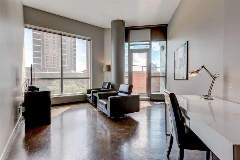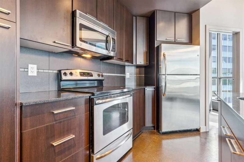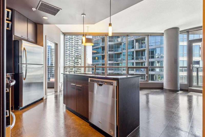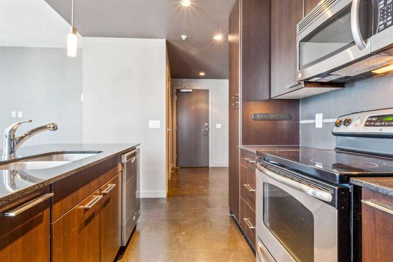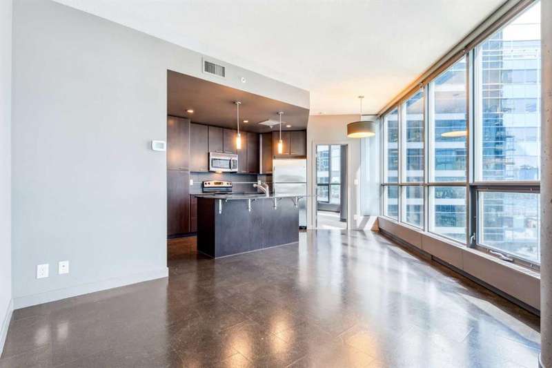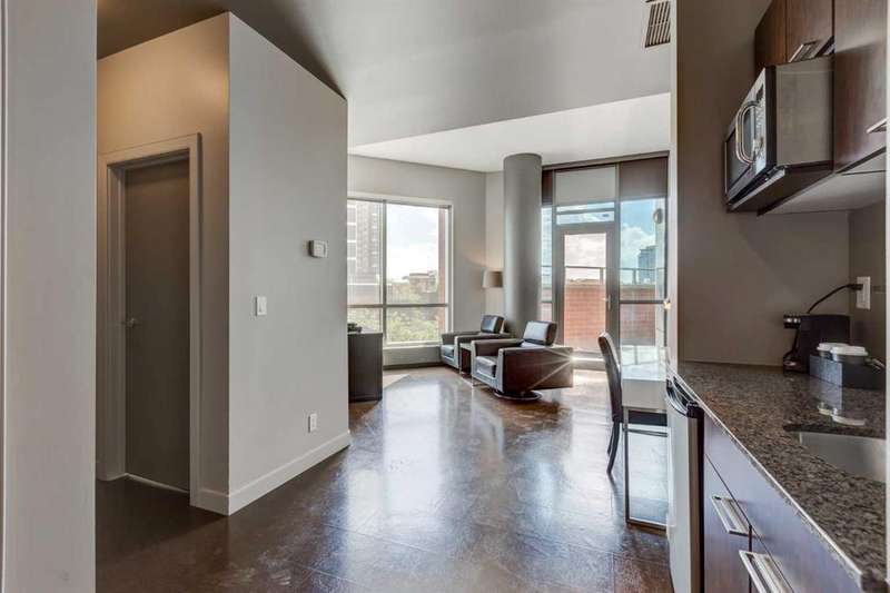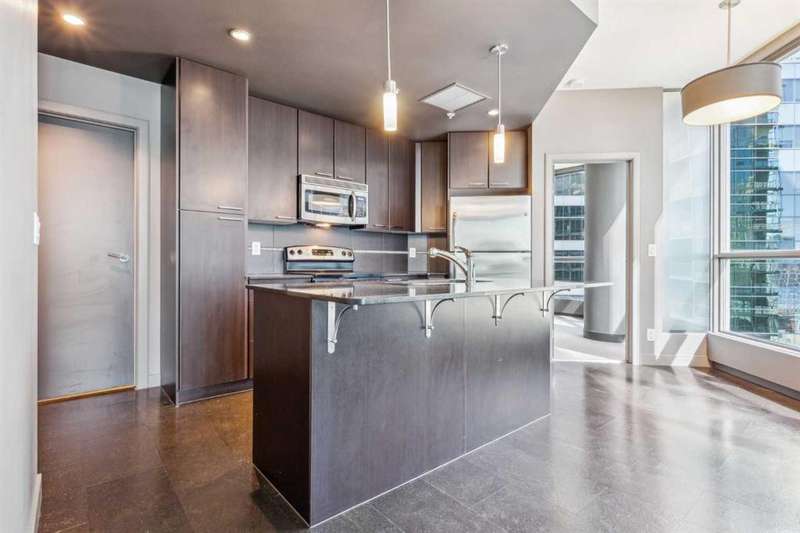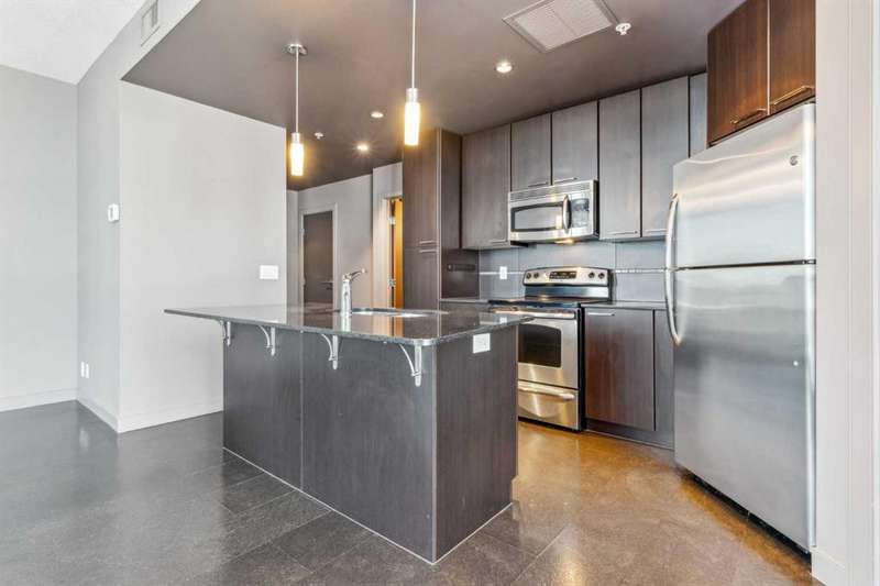 Welcome to unit 1004 at Keynote 1 – this beautifully upgraded 1-bedroom, 1-bathroom condo offers floor-to-ceiling windows and soaring 9-foot ceilings that flood the space with natural light, perfectly complementing the open-concept design and modern finishes. Step inside to find a bright, spacious layout accented by sleek cork flooring, polished granite countertops, and stainless steel appliances. The contemporary kitchen is as functional as it is stylish, complete with full-height cabinetry, a large breakfast bar, and modern lighting. Whether you're entertaining guests or unwinding after a long day, this space delivers comfort, function, and flair. The oversized bedroom acts as a private retreat with a generous walk-through closet, and direct access to a 4-piece ensuite finished with a sleek vanity and a bathtub/shower combo. There’s even the convenience of in-suite laundry and central air conditioning. But the lifestyle doesn’t stop at your front door. Keynote 1 is renowned for its resort-style amenities: A state-of-the-art fitness centre with cardio and weight rooms Residents' lounge with pool table, and TV area Landscaped rooftop courtyard with gas BBQs Two guest suites, bike storage, and a storage locker the size of a small room On-site manager and secure titled underground parking Located in Calgary’s vibrant Beltline community, Keynote Urban Village places you at the center of it all—Sunterra Market, Starbucks, 5 Vines Wine & Spirits, and the +15 walkway are just steps from your elevator. You’ll also enjoy easy access to the C-Train, downtown offices, river pathways, and the city’s best dining and entertainment. Don’t miss your chance to live in one of Calgary’s premier buildings. Book your showing today and come experience life at Keynote.