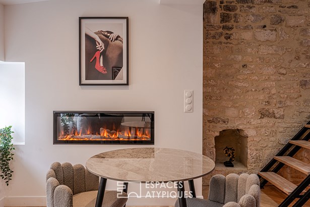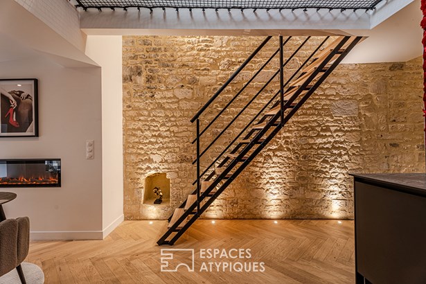 Nestled in the heart of Caen's historic center, yet sheltered from any noise, this unique duplex occupies the top floor of a period building. This magnificent contemporary loft, measuring 35 sq m (49 sq m of floor space), brilliantly combines historical charm with modern comforts. From the moment you enter, the property's unique character is immediately apparent: an exposed stone wall and a spectacular cathedral-ceilinged living room make a striking impression. The atmosphere is warm and inviting, generously punctuated by large windows that flood the space with natural light. The kitchen, open to the living room, is designed for conviviality. On the ground floor, an 11 sq m bedroom is cleverly separated from the living room by a partition wall and includes a private bathroom. A suspended staircase leads to the upper floor, where a unique hanging net offers a surprising view overlooking the living room. This mezzanine space can easily be converted into a second bedroom, an office, or a comfortable TV room. This unique duplex represents a rare opportunity on the Caen market. Its spectacular proportions, abundant natural light, and central location make it a truly exceptional property! Subject to co-ownership regulations. 66 residential units. Annual charges: EUR444. No ongoing legal proceedings. Information on the risks to which this property is exposed is available on the Georisques website: www.georisques.gouv.fr.