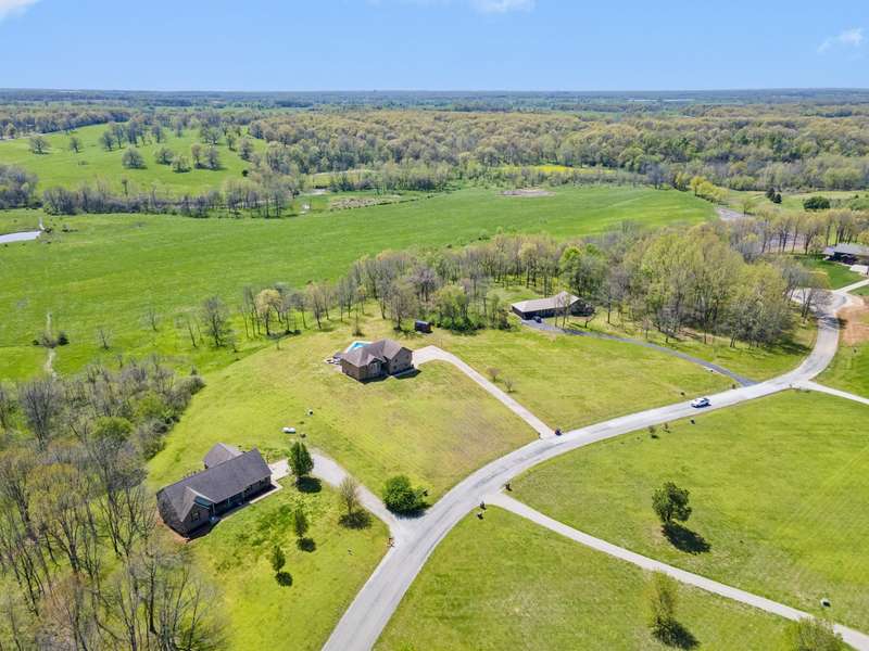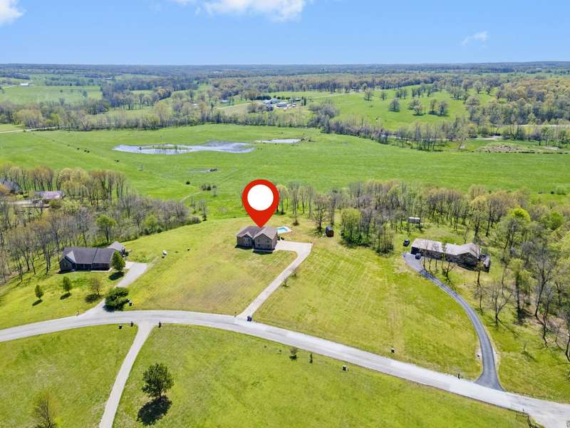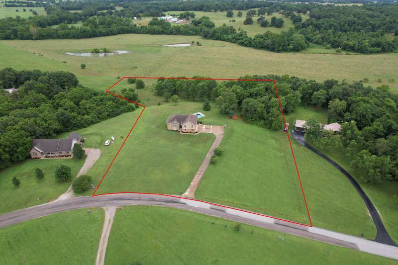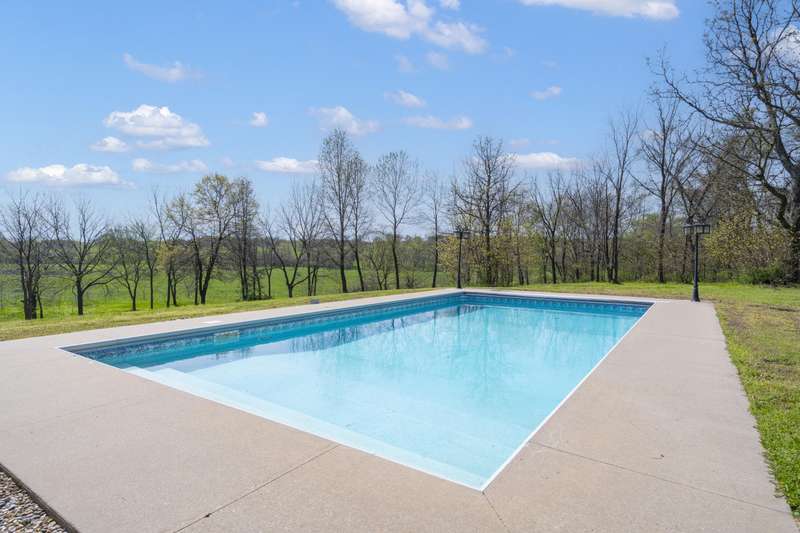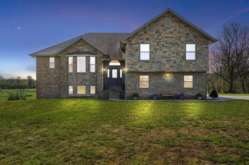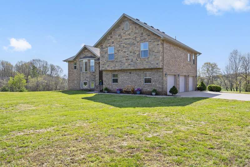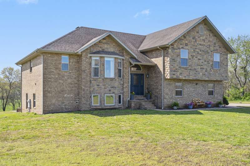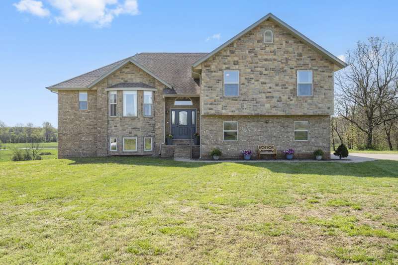 Stunning all-brick & stone home on 5.1 acres near Aurora, Missouri's Honey Creek Golf Course. Enjoy breathtaking countryside views, a saltwater pool, wildlife sightings, and luxury living throughout. This custom 4 bed, 3.5 bath home features a gourmet kitchen with Wolf appliances, hardwood floors, high ceilings, and a spa-like primary suite with heated marble floors & walk-in closet. The walk-out basement includes a second living space, a soundproof studio, and more. Heated 3-car garage with built-in bar, TimberTech deck, firepit patio, whole-house generator & top-tier finishes throughout. This home offers breathtaking panoramic countryside views. From vibrant sunrises and sunsets to frequent visits from deer, turkey, and other wildlife, the setting provides a peaceful, private retreat. An in-ground saltwater pool with an automatic cover adds the perfect touch for both relaxation and family fun. Custom-built in 2012 by renowned builder Bill Michel, this home reflects superior craftsmanship and timeless design. Inside, rich hardwood floors, soaring ceilings, and two cozy gas fireplaces create a warm and elegant atmosphere. The formal dining room includes a built-in China hutch and bookcase, making it ideal for hosting or everyday use. The chef's kitchen is a true standout, featuring custom Alder cabinetry, granite countertops, and top-tier stainless-steel appliances including a Wolf gas cooktop with griddle, double ovens, built-in microwave, and refrigerator. With a double sink and a second prep sink, the space is as functional as it is beautiful. A spacious breakfast nook with breakfast bar leads directly to the maintenance-free Timber Tech deck--perfect for outdoor dining and entertaining. Call today for your private showing. This home & property will not disappoint!