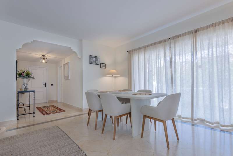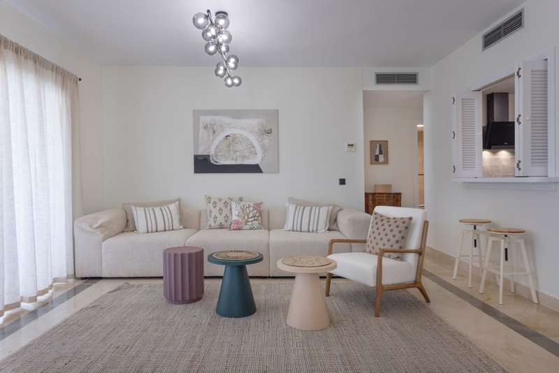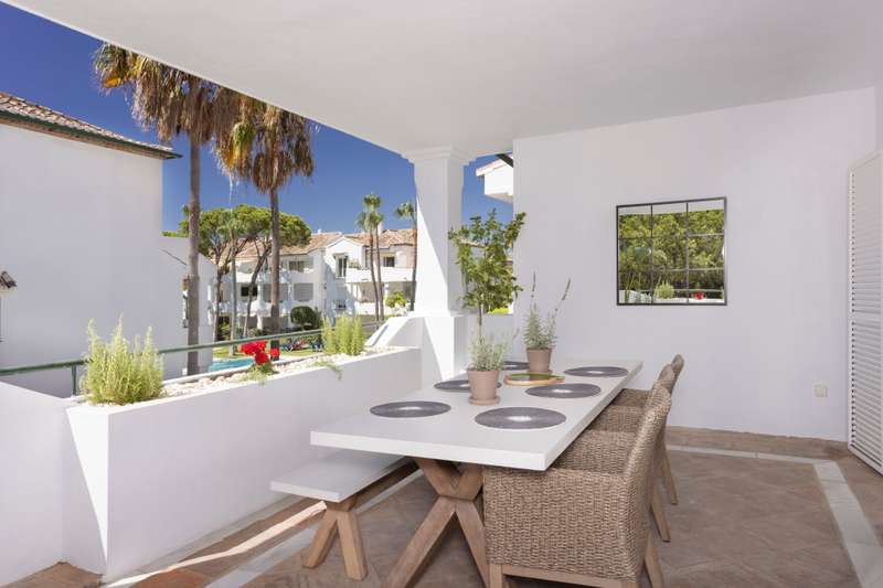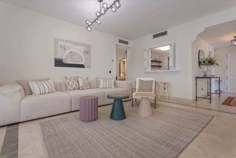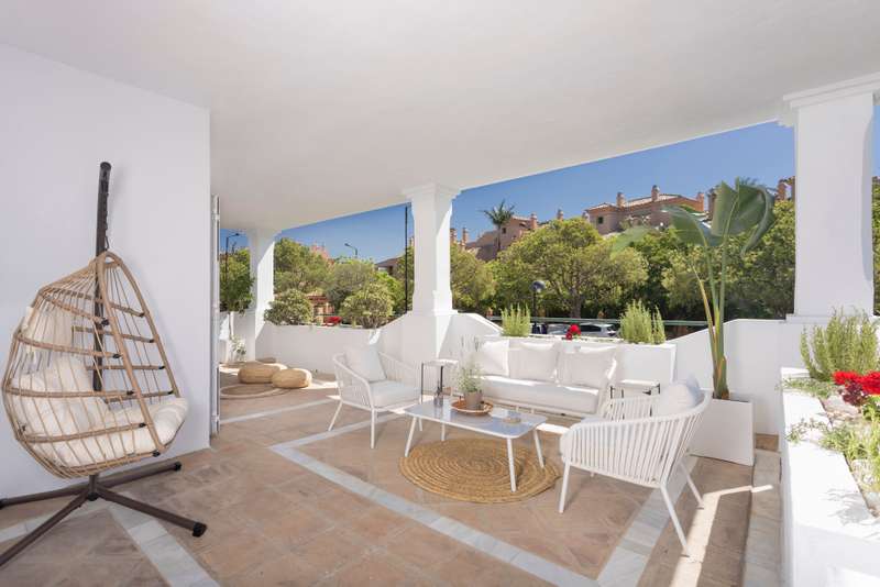 Available for long-term rent, this wonderful apartment is located on the beachside of the prestigious New Golden Mile. Just 10 minutes from Puerto Banús, 5 minutes from San Pedro, and within walking distance of shops, bars, and restaurants, the location is unbeatable. A welcoming hallway leads into a large separate kitchen with an adjoining laundry area.. From there, you enter a bright and open living and dining area with large windows that open onto a wrap-around south-facing terrace. The terrace is partially covered, offering versatile outdoor living – whether you want to relax in the lounge area, dine al fresco, or sunbathe on the loungers. The master bedroom features an en-suite bathroom and direct access to the terrace. There are also two additional bedrooms and bathrooms, providing plenty of space for family or guests. Additional features include a storage room for convenience.