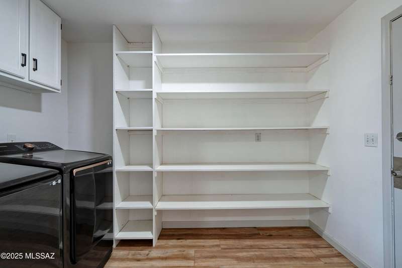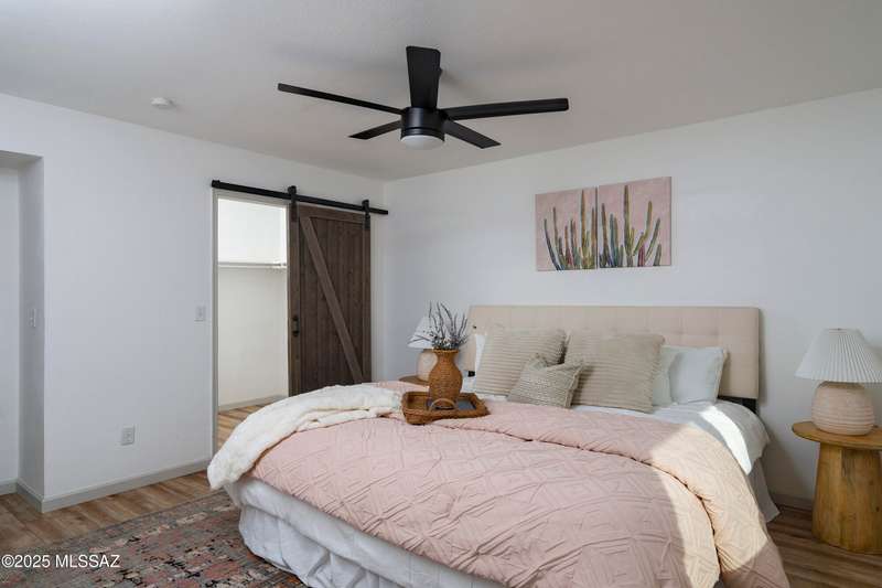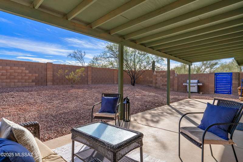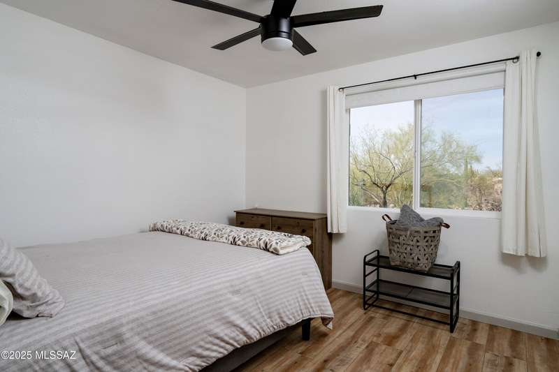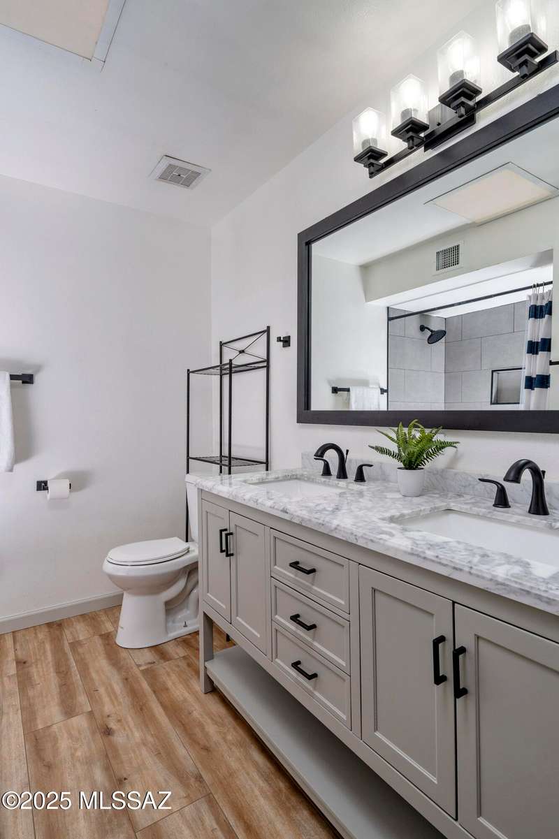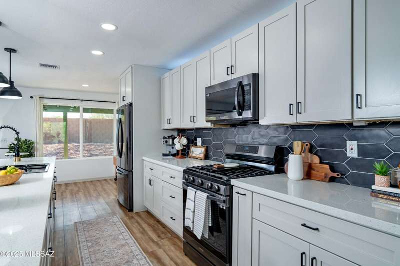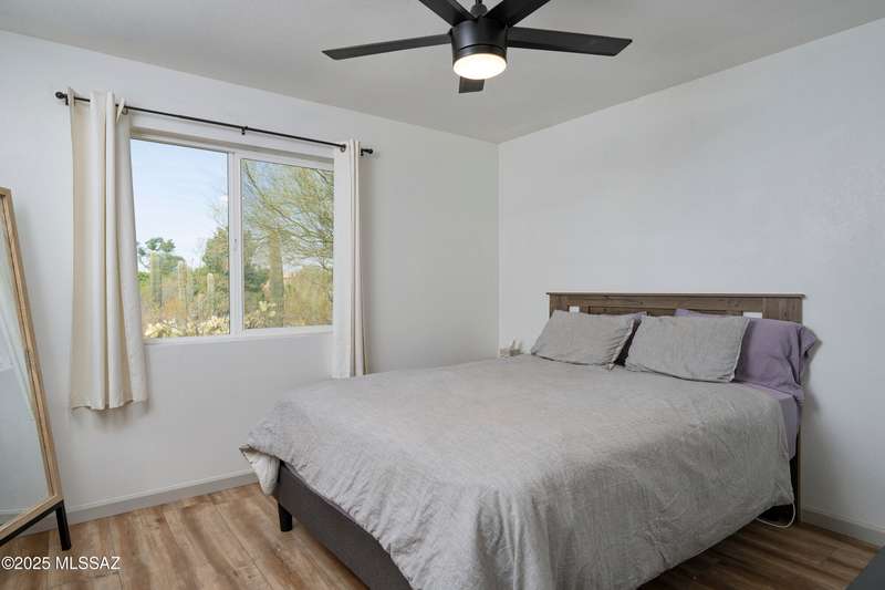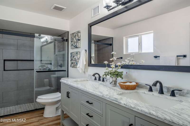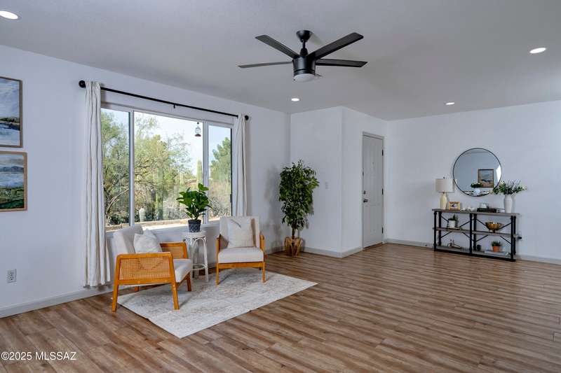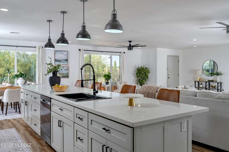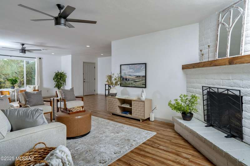 Stunning 4 bed/2 bath, 2,075 sq ft home in Casas Adobes on a large lot with no HOA. Private lot w/ mountain views and located on a cul de sac. Completely remodeled with gorgeous vinyl flooring throughout. Enter to a large great room with a stunning kitchen featuring modern white cabinets and quartz countertops. Huge kitchen island with tasteful pendant lighting...the perfect space for entertaining. Great room features a cozy gas fireplace ideal for the colder Tucson nights. Primary suite with walk-in closet, tastefully remodeled bathroom and secret room for extra storage. Newer HVAC, hot water heater, and windows. Large laundry room and room off carport with tons of storage. This one is ready to go...just move in!