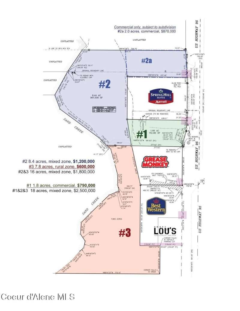 8.44 acres located between Sand Creek and Highway 95, with access from the Highway and frontage both on Sand Creek and the Highway. The first 660' from H95 centerline are zoned 'C' commercial and small remainder is zoned 'R' rural. Utilities run along the highway frontage, including water, sewer, power, phone and gas. Small 1,000 SF shop at the far northeast corner is included in sale but assigned no value. Could make an incredible residential subdivision site with 1,000'+ feet of creek frontage all while being IN TOWN!