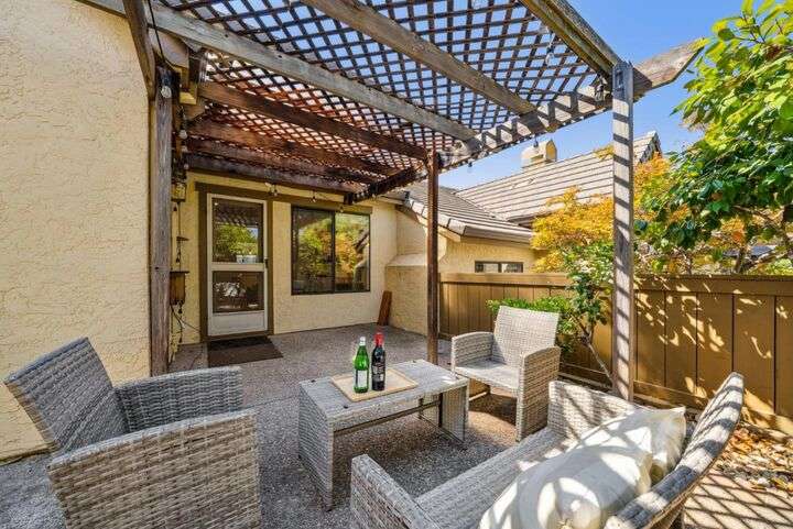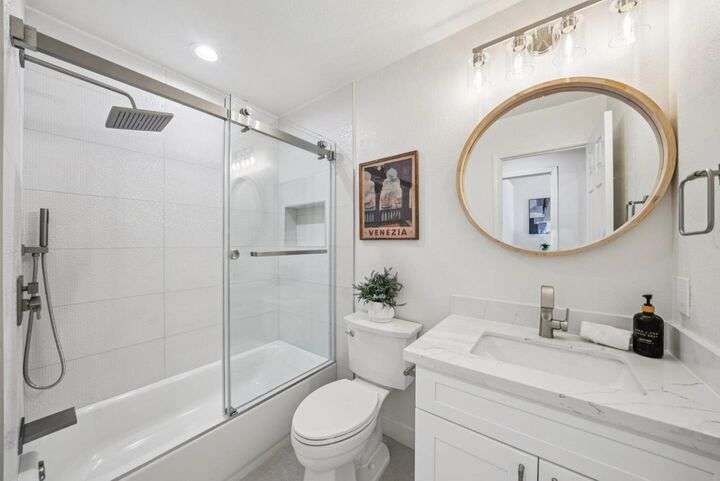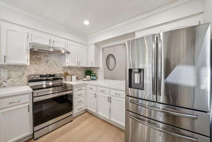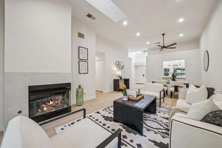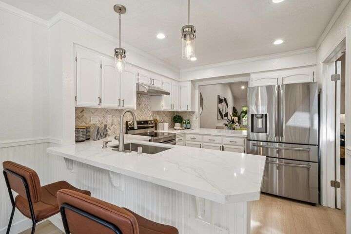 Welcome to 7597 Tayside Drive, a beautifully remodeled 2-bedroom, 2-bathroom home in the highly sought-after 55+ community of The Villages in San Jose. This 1,307 sq. ft. residence offers fresh paint, new waterproof laminate flooring, skylights, and a spacious living/dining area with a wood-burning fireplace and access to the yard with fruit trees. The modern kitchen features quartz countertops, designer backsplash, recessed and pendant lighting, and stainless steel Samsung appliances. The primary suite boasts double sinks, quartz vanity, a soaker tub, separate shower, and large closets, while the updated hall bath includes new tile and fixtures. Additional highlights include central heating and A/C, side-by-side laundry, storage cabinets, and a 2-car garage. The Villages provides resort-style amenitiesgolf, pools, tennis, fitness centers, clubs, and walking trailsall within a secure 24-hour gated community. Conveniently located near Highway 101, Capitol Expressway, shopping, dining, and medical services.