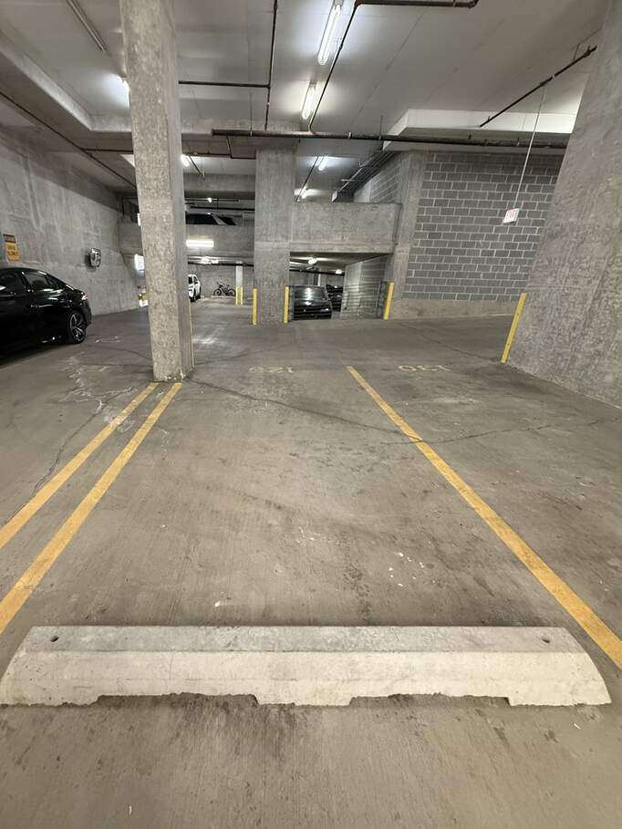 Prime parking space in secure indoor boutique garage. Easy in and out, no entry restriction. Parking spot measures exactly 8' wide (from iside yellow line to inside yellow line) and 16' long.