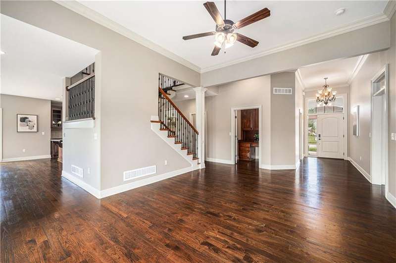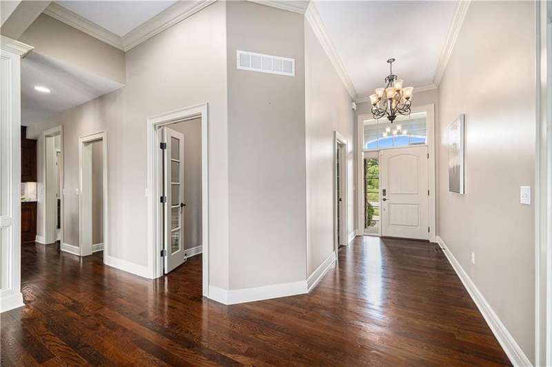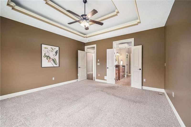Impressive 1.5-story residence by Carson Custom Homes, ideally positioned on a spacious corner lot in the sought-after Montebella community. This beautiful home features 4500+ square feet, 4 bedrooms, 4.5 baths, 3 car attached garage, and walk out lower level. Abundant natural light enhances the semi-open and functional floor plan. The chefs kitchen is a standout with its oversized center island, granite counters, hardwood flooring, walk-in pantry, SS appliances, gas range, and rich wood cabinetry. A warm hearth room with a custom fireplace flows seamlessly into the formal living room and dining area. Formal living room boasts high ceilings, a wall of windows, and gleaming hardwoods Private office with French glass doors creates the perfect home workspace located off formal living room. The main-level primary suite offers vaulted ceilings and a luxurious ensuite featuring dual vanities, a whirlpool tub, walk-in shower, and generous sized closet. Upstairs, youll find three spacious bedrooms with hardwood floors and walk-in closets. Two of the bedrooms share jack & jill bath, while other provides its own ensuite. The finished walkout lower level is designed for entertainment, complete with a theater room and full bath. Outdoor living is just as inviting, with a covered deck and walk-out patio. Move in ready or make your own finishing touches. Enjoy all of the amenities Montebella has to offer, swimming pool, club house, and walking trails. Convenient highway access makes commuting simple. This remarkable home is one you wont want to miss!