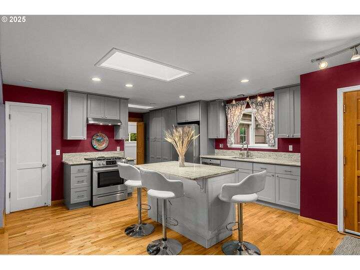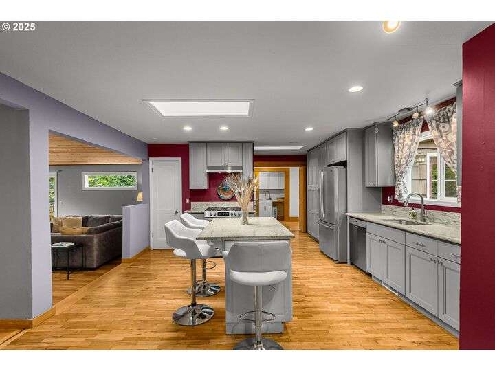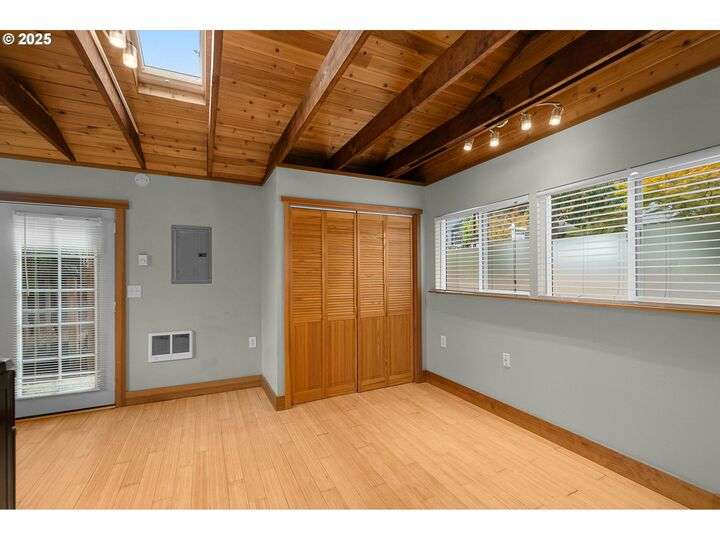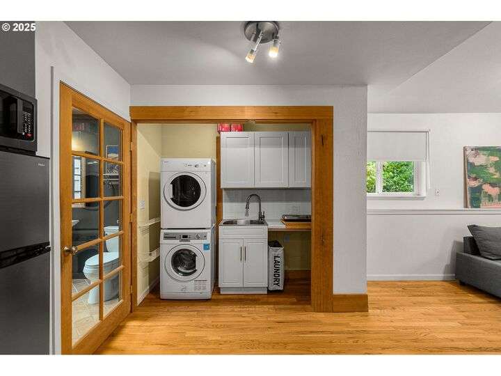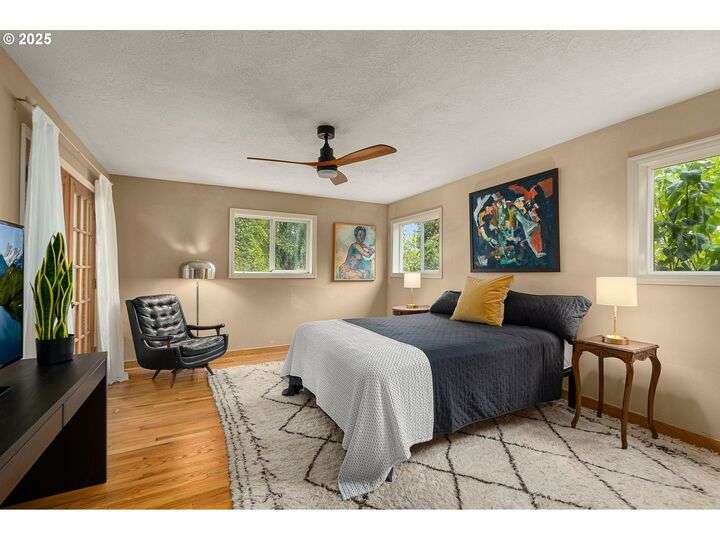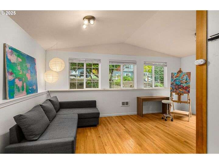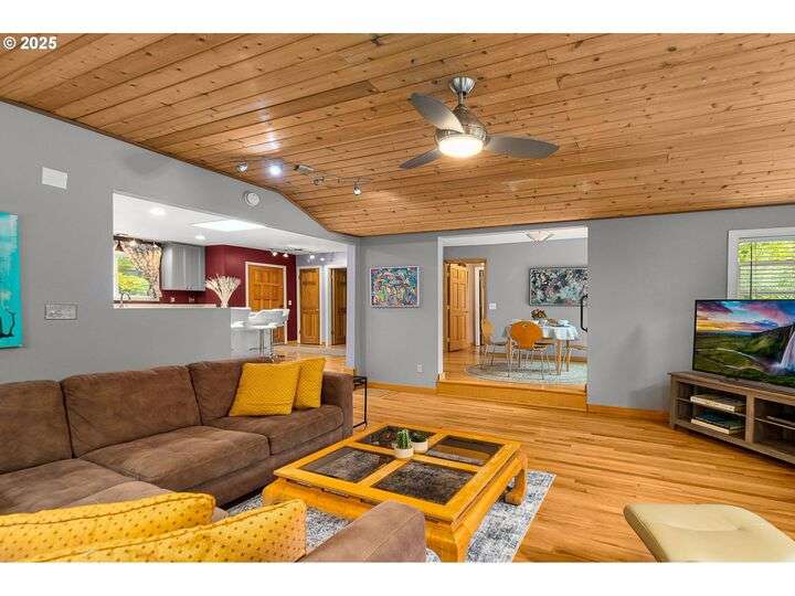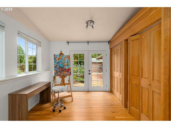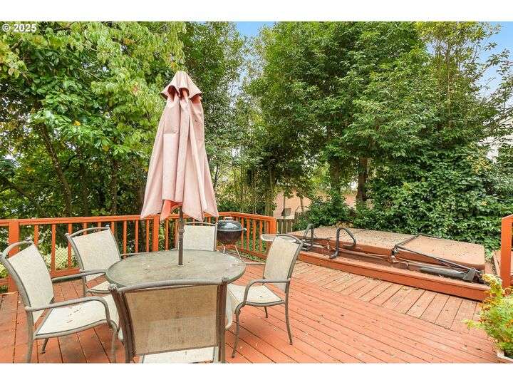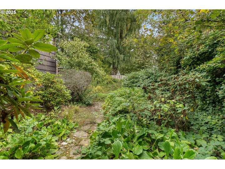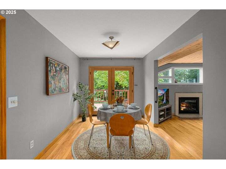 One level living in Multnomah Village! Sunken living room with vaulted wood ceiling and gas fireplace. Dining room has French doors flowing to deck. Updated kitchen with island, skylight and pantry/prep/wet bar area. Wood floors throughout. Two of three bedrooms in main home feature ensuite bathrooms and French doors to exterior. Laundry area with sink. Detached 300 square foot ADU studio rents for $1,400/month, with wood floors, vaulted wood ceilings, skylights, fully equipped kitchen with gas range, dishwasher and microwave; laundry in unit. Lush private garden with decks and swim spa on large lot. Room for additional ADU. Five blocks from Multnomah Village shops, restaurants and bus lines. Mere blocks to Safeway and Fred Meyer. Less than a mile to Gabriel Park. Easy access to Highway 99 and I-5. *ADU bathroom, bedroom and SqFt included in total* [Home Energy Score = 2. HES Report at https://rpt.greenbuildingregistry.com/hes/OR10242276]