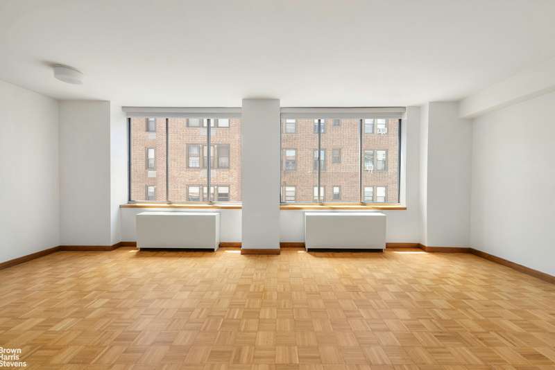 Wood flooring from foyer to the open living area are complemented with two HVAC units situated at the base of its oversized wall of windows bringing in an abundance of natural light. Windows have pull down shades to block light for privacy.