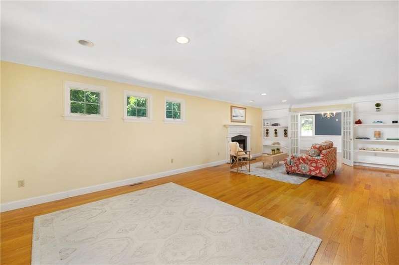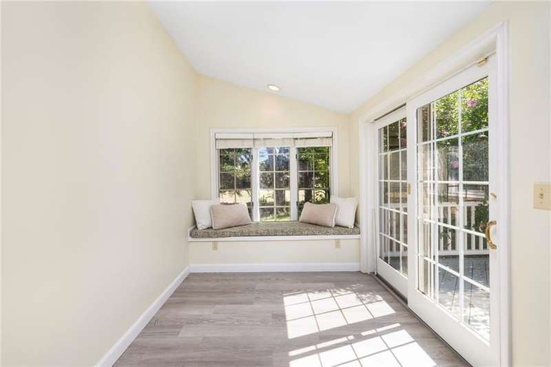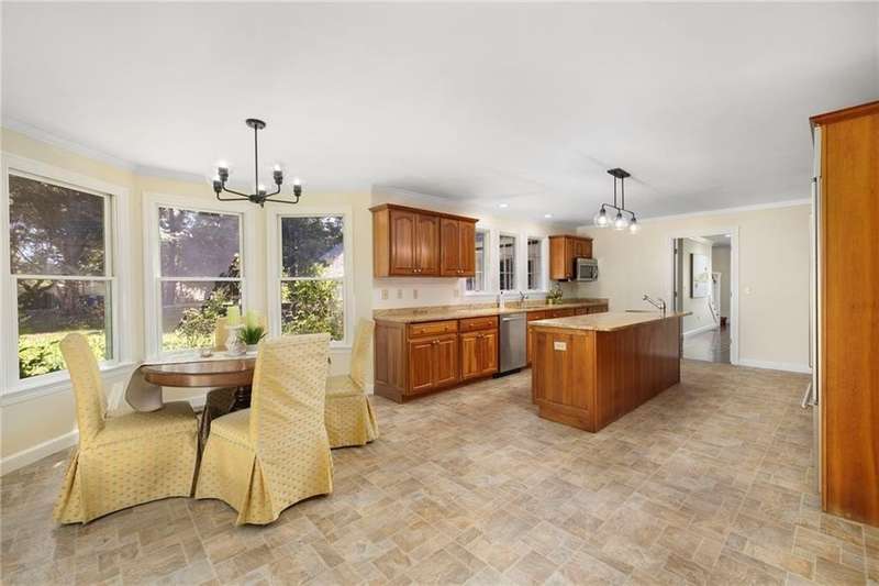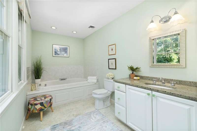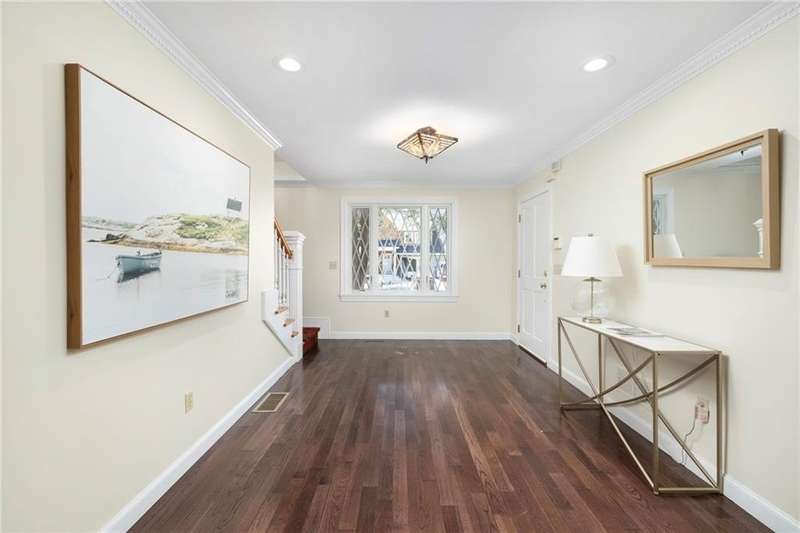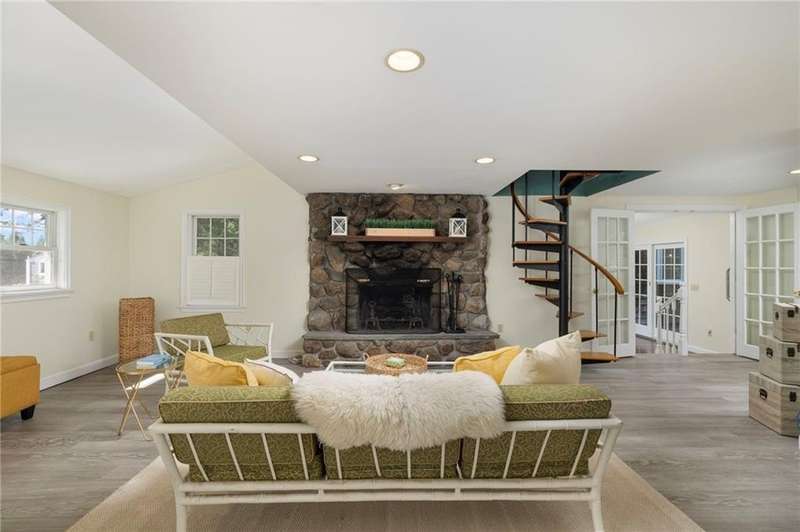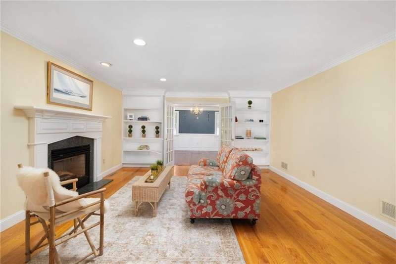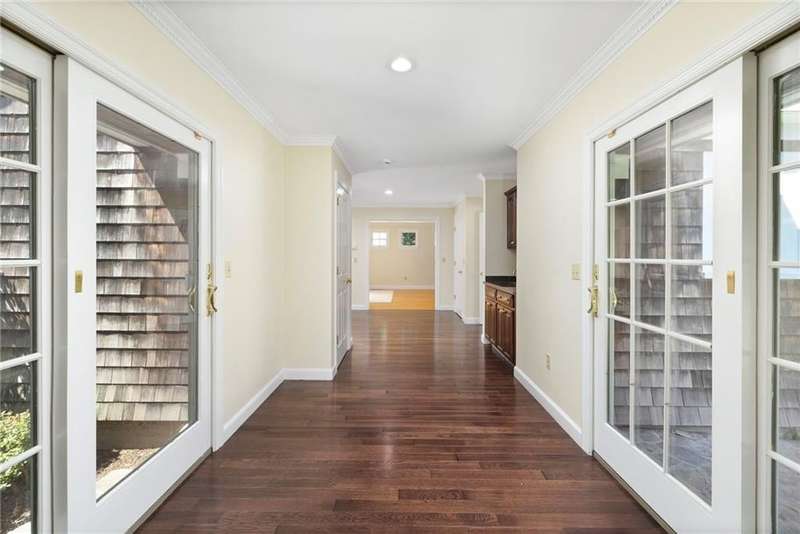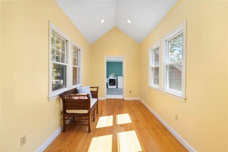 Tucked away at the end of a hidden lane in Jamestown Shores, this timeless shingle-style cottage is the definition of coastal quietude. Surrounded by natural beauty and set on a peaceful, private lot, the home blends classic charm with modern comforts. Inside, you'll find a gracious floor plan designed for easy living and entertaining. A welcoming formal living room with a gas fireplace flows into a sunlit dining area and a generous eat-in kitchen complete with center island and stainless appliances. Upstairs, two expansive ensuite bedrooms offer luxurious privacy, abundant storage, and space to unwind. The original wing of the home adds warmth and versatility with a cozy family room anchored by a traditional stone fireplace, a third bedroom opening to a glass-wrapped sunroom, a full bath, and access to a west-facing deck ideal for evening sunsets. This flexible space is perfectly suited for multi-generational living, guest quarters, or a dedicated home office. Outdoors, a fenced area provides a secure space for pets, while the open backyard invites gardening, gathering, or quiet moments under the sky. Minutes from Sunset Beach, Godena Farm and the Jamestown Bike Path, this home offers the best of island life.
