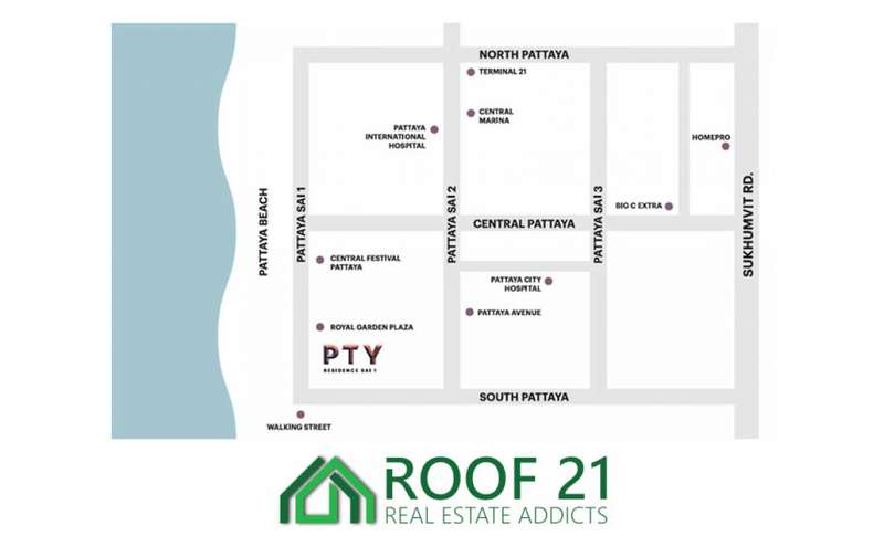 Discover unparalleled luxury at PTY Residence Sai 1, a 27-story condominium offering 327 meticulously designed units. Situated on the last freehold land on Pattaya Sai 1 Road, this prime location provides immediate access to the pristine beachfront, known locally as Beach Road.