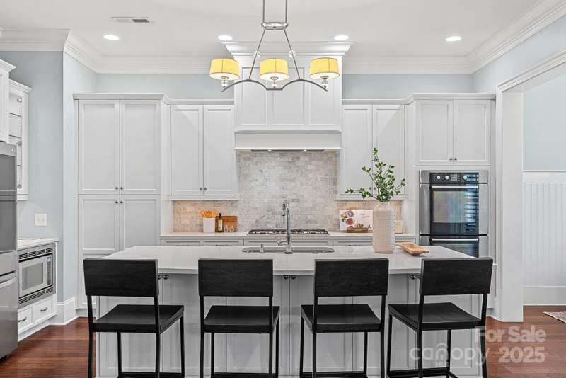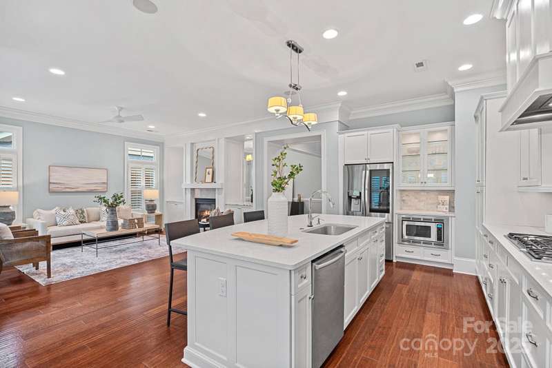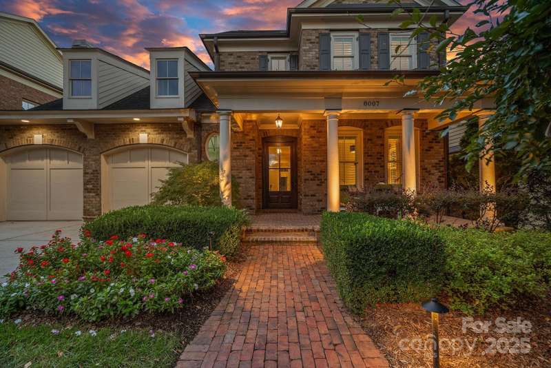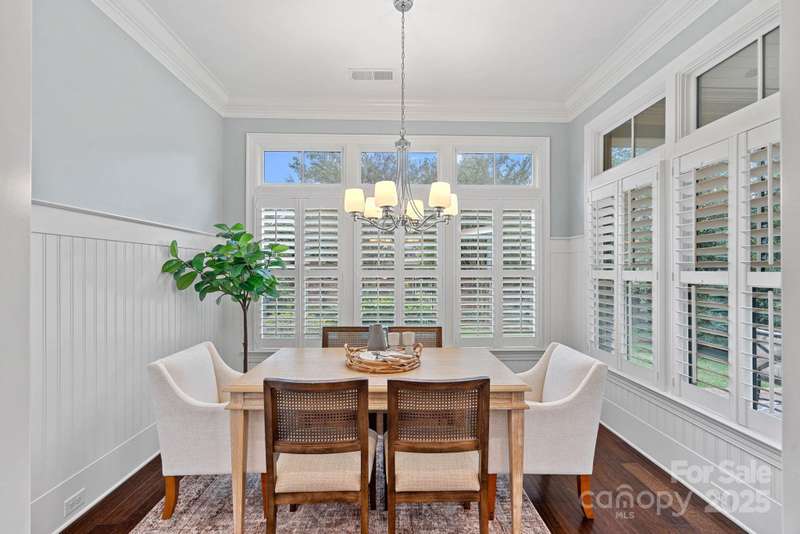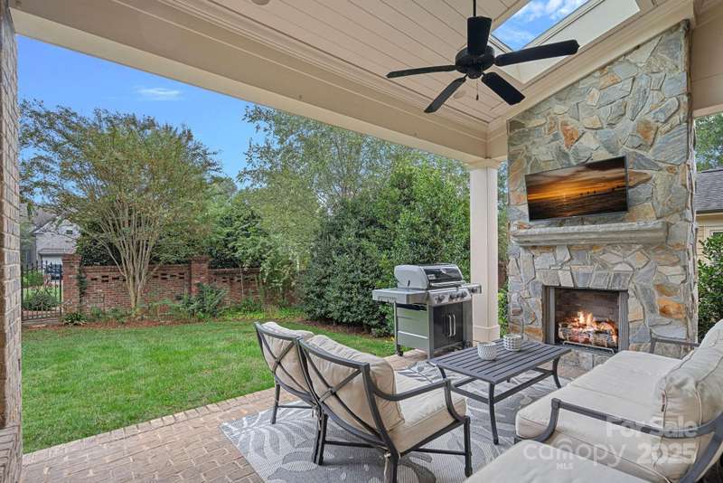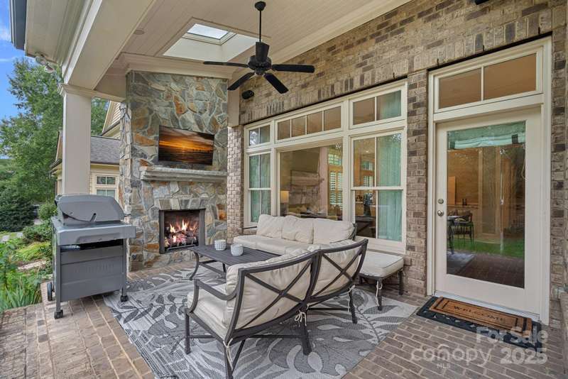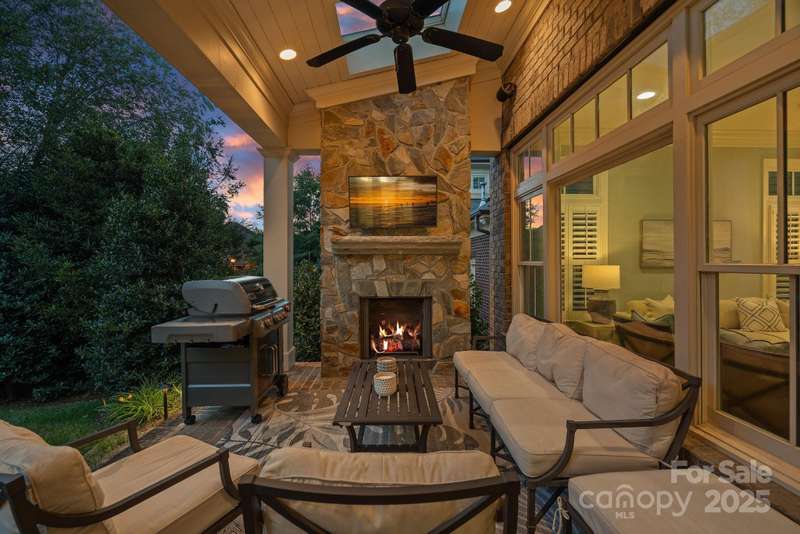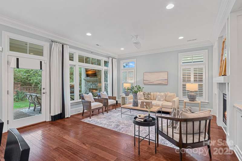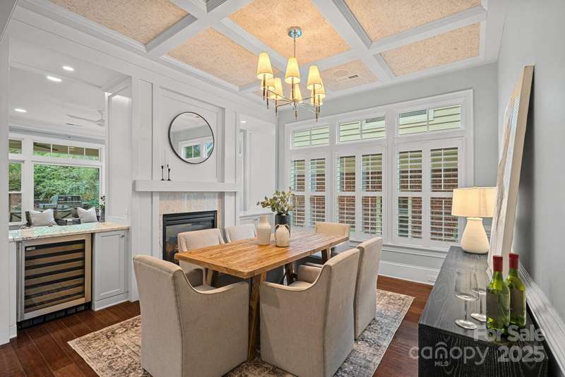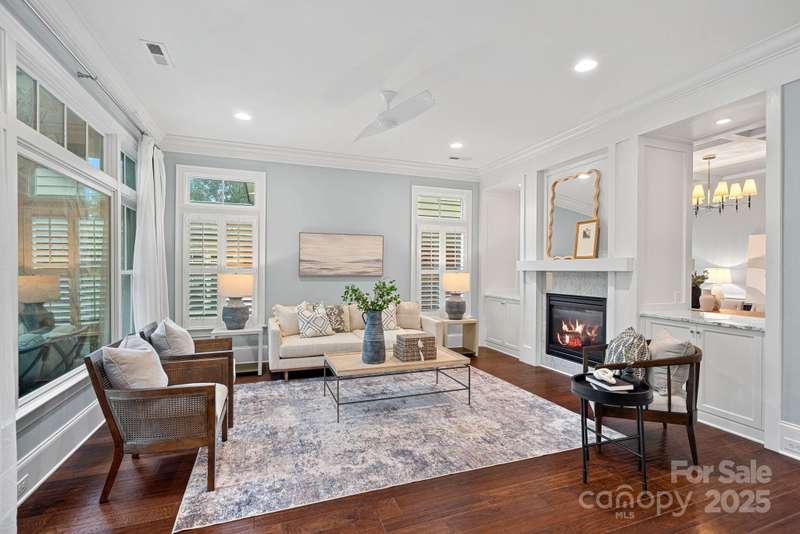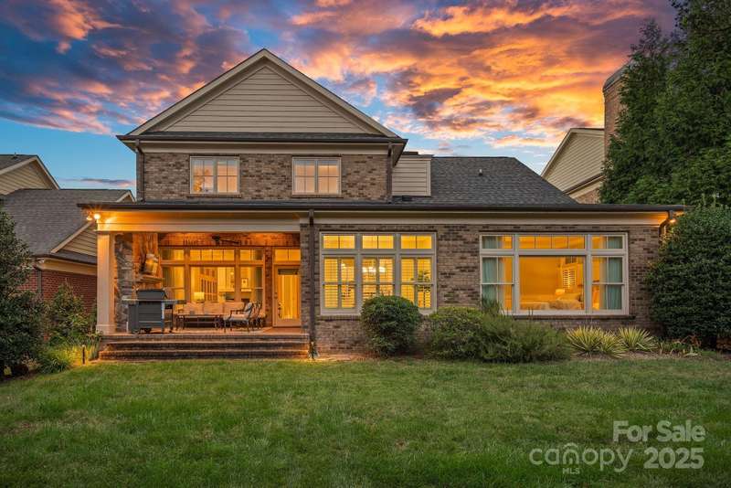 Stunning 4-bedroom home nestled in the highly sought-after gated community of Bellmore Hall. Built by Simonini Builders in 2010, this gorgeous home was the former model and blends sleek, modern lines with warm, inviting spaces. Inside you'll find a beautifully appointed kitchen featuring an abundance of cabinetry, a large center island, and a charming breakfast area with wainscoting and sunlit windows. The family room is open to the kitchen and boasts a see-thru gas fireplace to the dining room. Gather in the dining room with its coffered ceiling and enjoy the versatility of a stately front office or den. The primary suite is a true retreat, offering a spacious walk-in closet with a convenient washer/dryer hookup, stunning windows overlooking the lush backyard, an elegant tray ceiling with rope lighting and richly paneled walls. Adding to the home's appeal, a versatile bonus room serves as both a gym and rec/playroom. And for ultimate convenience, the two-car attached garage is equipped with an electric vehicle charging station. Enjoy direct access to the common greenspace and year-round outdoor living on the covered rear porch, complete with a cozy gas fireplace, mantel television and beautiful landscape lighting, front and rear, installed in 2023 and connected to solar photocell. Plantation shutters and quality millwork throughout! This home is truly a rare gem, offering a perfect blend of elegance, comfort, and modern convenience.