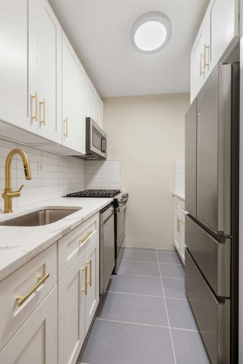 This sun-drenched home features a spacious living room with western-facing windows that overlook the building's serene, landscaped garden. The thoughtfully redesigned kitchen boasts sleek quartz countertops and backsplash, stainless steel appliances, and classic white shaker cabinetry.