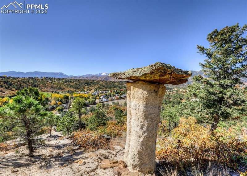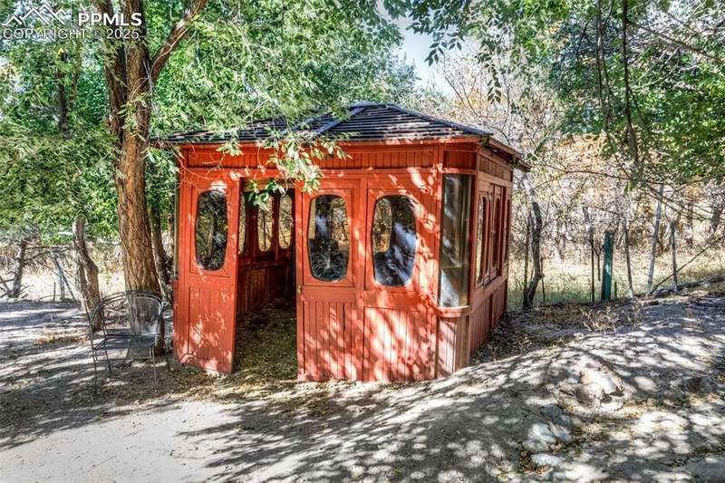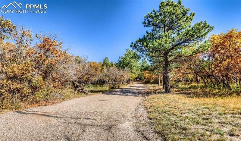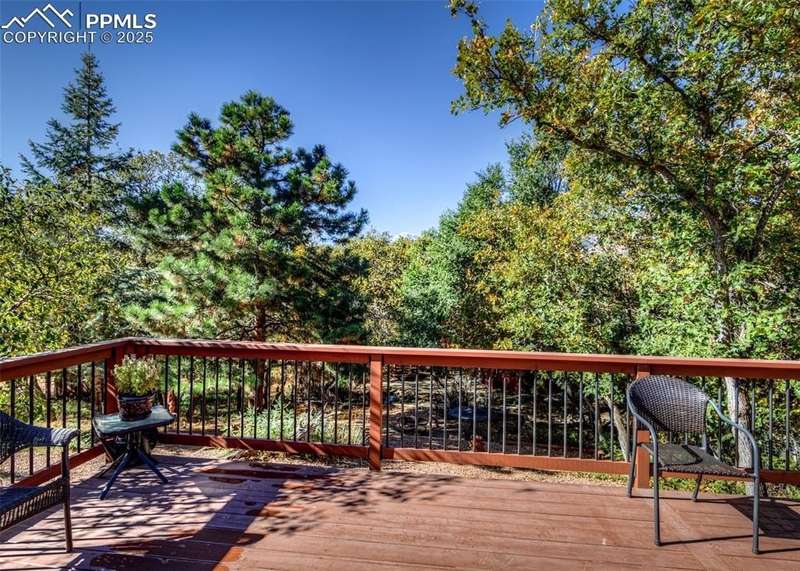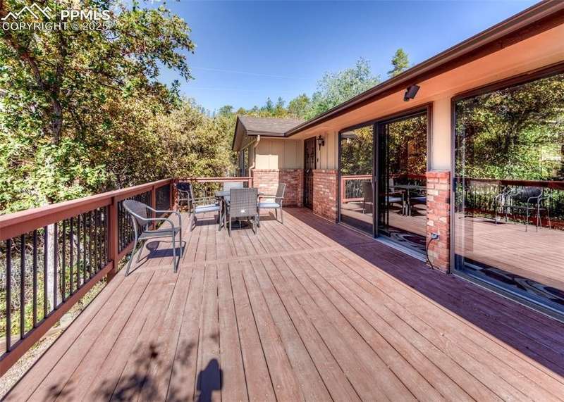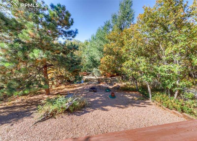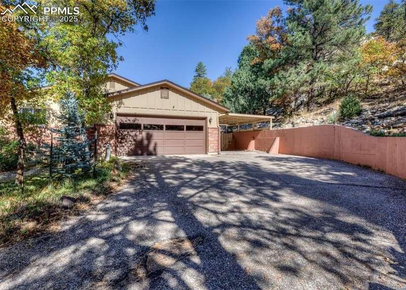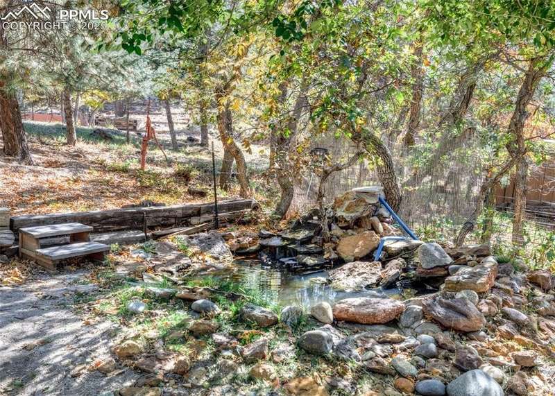 Hidden way way off the road behind towering pines & giant scrub oak with mountain, city & Pikes Peak views. One family custom 5 bedroom, 2 1/2 bath rancher on 2.5 forested acres with over 3600 sq ft, a 2 car attached garage + a 1 car attached carport ~ Open concept floor plan with lots of glass & sunshine, remodeled slab granite & stainless steel island kitchen ~ All LVP & hard surface flooring throughout except on the stairs ~ laundry sink ~ 2 fireplaces ~ Workshop with bench & vices~ whole house water filter & new reverse osmosis ~ A/C ~ hot tub ~ pond with waterfall ~ gazebo ~ paved south facing driveway ~ brand new roof ~ 2 wood burning fireplaces ~ 22x20 rear patio with hot tub, flat lawn area, large fenced in dog run, 27x12 new front deck ~ Hoodoo rock formations ~ newer furnace, a/c, 50 gal hot water heater, well pump & line to house, appliances, interior & exterior paint ~ septic just inspected, cleaned & certified ~ lot goes all the way to the top of the ridge where there is a walking path & breathtaking views ~ Horses allowed & there is room for a barn ~ county property surrounded by city. Other rooms are finished shop & unfinished storage room. Baths & windows are original- great family home with all oversized bedrooms- immaculate & "move in" ready. No HOA