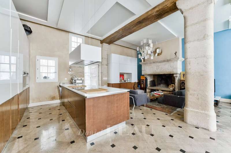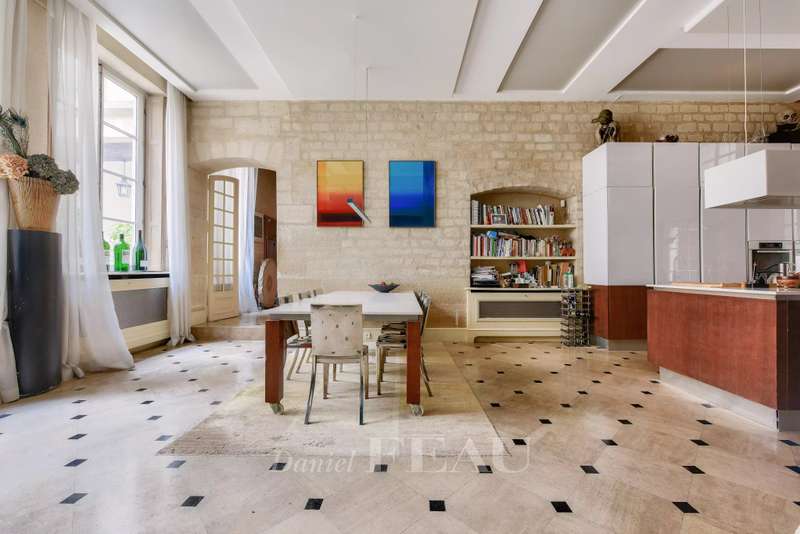 Rue Quincampoix. This magnificent duplex apartment overlooking a paved courtyard is on the ground and first floor of a listed 17th century co-ownership. Directly accessed by means of the main courtyard, it offers 176.26 sqm of living space including a grandiose entrance hall, a 76.33 sqm living/reception room featuring 3.90 metre high ceilings and with a TV lounge featuring a stone fireplace, a fully equipped kitchen, a second sitting room area and a dining room, and a bedroom. Magnificent period features include exposed stone, marble, a fireplace and exposed beams. A wide staircase with wrought-iron banisters leads to two further bedrooms, two bathrooms and a dressing room.