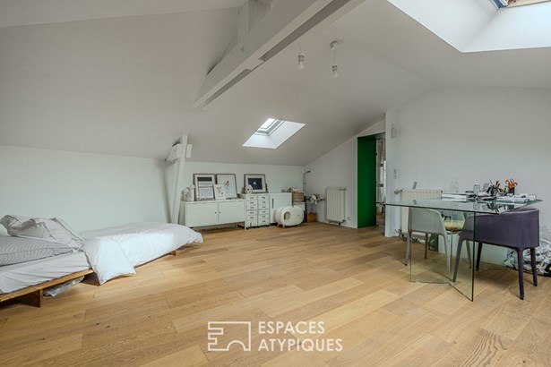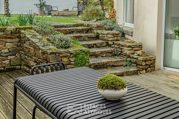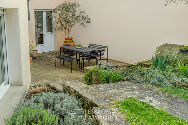 A unique space, an Espaces Atypiques exclusive. In the heart of Vieillevigne, this renovated 132 sqm town house combines authenticity, modernity and simplicity, in the immediate vicinity of shops, schools and transport. Its exposed brick and stone details give it a warm atmosphere, enhanced by a careful renovation where raw and natural materials create a strong identity. From the entrance, the gaze is lost in the light. The living room, bathed in light, is structured around a functional open kitchen and a welcoming dining room, heated by a wood stove. This generous space benefits from through light and direct access to the terrace. Then, behind a large stone wall, an intimate living room is revealed, offering a cocoon conducive to moments of reading and sharing. A custom layout has been designed in the entrance to optimize storage. A laundry room and a shower room with WC complete this level. A raw concrete staircase, the true centerpiece of the house, leads upstairs, where a landing-library serves three spacious bedrooms with clean lines. One of them, under the slope, has approximately 30 sqm of floor space and can easily be redesigned to create a fourth bedroom or an office. A second bathroom with WC completes this floor. The minimalist approach of this house - open layout, clean lines, raw and monochrome materials - generates a feeling of calm, space and freedom, where the mind is freed from all superfluous. Outside, a landscaped and intimate green setting welcomes a wooden terrace facing southwest, below an enclosed garden without vis-a-vis. A place conducive to relaxation, designed to enjoy the beautiful days with minimal maintenance. An additional advantage: the possibility of acquiring an adjoining plot of land of 442 sqm, including two garages (45 sqm and 60 sqm). This space offers great potential for rehabilitation, but can also simply allow you to enjoy a larger garden and covered parking. Just 35 minutes from Nantes, 30 minutes from La Roche-sur-Yon and 13 minutes from Montaigu train station, this house combines all the advantages of a peaceful life close to amenities. To discover this property, contact: Marjorie Fioleau EI on 06 22 59 76 32 marjorie.fioleau@espaces-atypiques.com Sales Agent RSAC 901 088 591 NANTES ENERGY CLASS: C / CLIMATE CLASS: C. Estimated amount of annual energy expenditure for standard use between EUR1,870 and EUR2,590 indexed to the years 2021, 2022 and 2023 (subscription included). Information on the risks to which this property is exposed is available on the Georisques website: www.georisques.gouv.fr