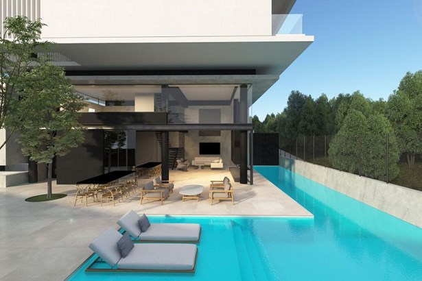 On the ground floor, a 115 square meter space welcomes you with a living room, sitting area, dining area, kitchen, WC, and a 76 square meter swimming pool.