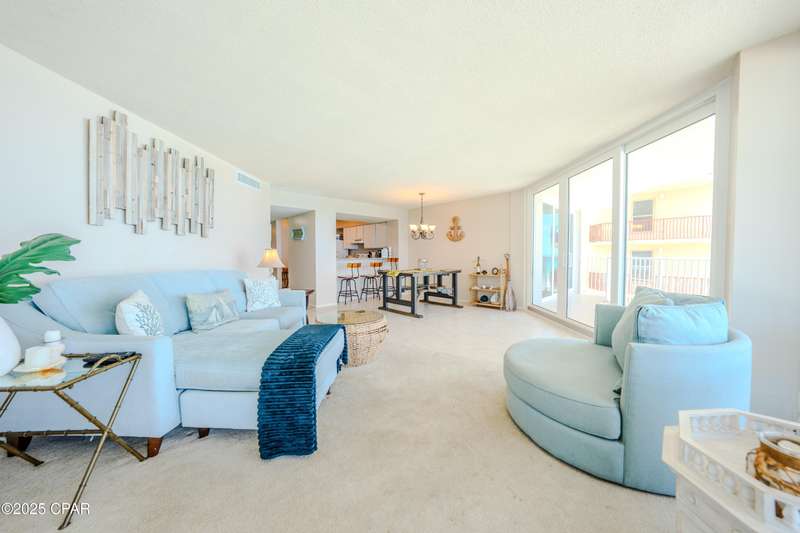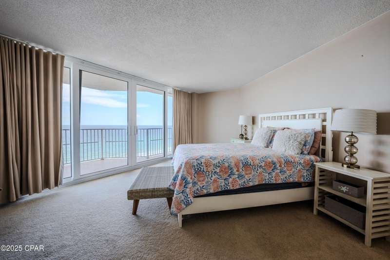 Spectacular end unit with floor to ceiling windows and doors offering gulf views from EVERY room! Enjoy the breathtaking sunsets from your balcony or any room you choose. The open concept kitchen, living and dining allow for entertaining or great family conversation while vacationing. As a 2nd home there is a small room adjacent to master that could be an office or private sitting area. It currently offers an additional space for sleeping. A full-size laundry room for convenience. Enjoy your morning coffee or afternoon cocktails from the private balcony expanding the entire length of the residence. Priced to allow you to personalize and update as you desire to increase rental revenue or enjoy your luxury private retreat. This floorplan has a secluded master, and all rooms are spacious with large closets and additional closets for storage. The functionality offers potential for private, full-time home or ability to maximize rentals. All the windows and sliding glass doors are already upgraded. Garage parking space included with ownership of this home!