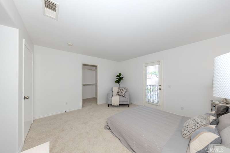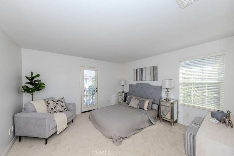 Upstairs, new carpet runs throughout. The primary bedroom features high ceilings, a Juliet-style balcony, and a large walk-in closet. The en suite bath includes laminate wood flooring, dual sinks, a soaking tub, a walk-in shower, recessed lighting, and a separate toilet room. A loft-style landing between bedrooms offers a flexible space for work or reading. Two additional bedrooms with mirrored layouts share a full bath with laminate flooring, a single sink, and recessed lighting.