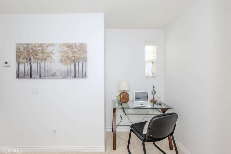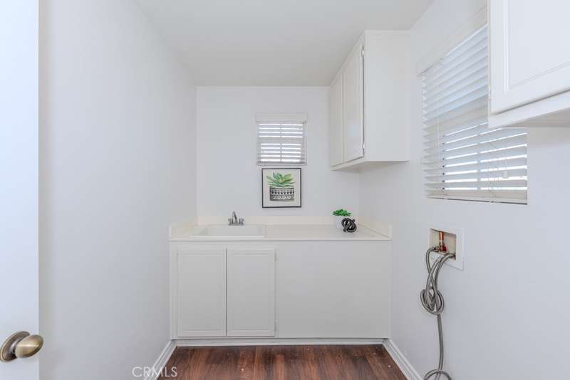 A separate laundry room upstairs provides built-in upper cabinets, a utility sink, and a folding counter. Outdoors, the backyard includes a concrete patio, a block wall for privacy, a garden bed, and a turf area for low-maintenance use.