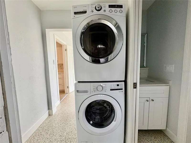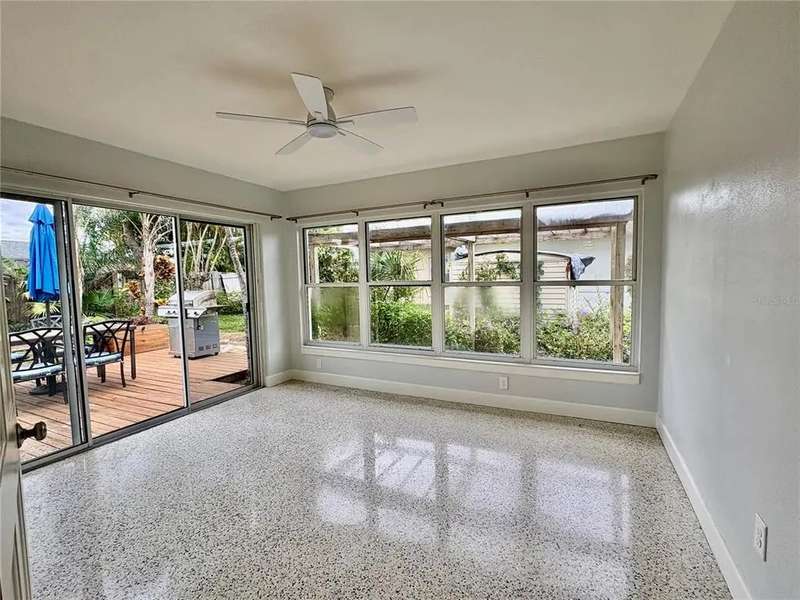 Welcome to your tropical escape—ideally located on a peaceful cul-de-sac, just a short walk from the sugar-white sands and tranquil waters of the beach, with special Belleair Beach parking access. This beautifully maintained, move-in-ready home offers exceptional curb appeal and a light, airy interior designed for relaxed coastal living. Inside, you'll find gleaming terrazzo floors throughout, with new baseboards. The open-concept living and dining area flows effortlessly into a stylish galley kitchen, complete with new crisp white cabinetry, quartz countertops, a tile backsplash, and updated stainless steel appliances. A sun-drenched bedroom just off the kitchen features sliding glass doors and walls of windows that bathe the space in natural light. This area also includes a full bathroom with a walk-in shower and easy access to a dedicated laundry room with a full-size washer and dryer for added convenience. On the opposite side of the home are two generously sized bedrooms and a second full bathroom with a tub/shower combo—perfect for family or overnight guests. The AC system was replaced in 2024, water heater in 2023, roof resurfaced in 2022. Start your mornings in the peaceful enclosed patio with a cup of coffee as the sun rises, and end your day enjoying backyard barbecues on the outdoor lanai. Whether you're entertaining or unwinding, the private, tropical backyard provides the perfect setting for making lasting memories.