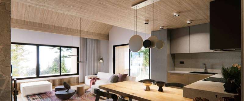 All the apartments in chalets are sold finished, and the basic package includes an elegant style interior design. As future owners, you can experience a true mountain escape where the cozy and inviting interior mirrors the awe-inspiring landscape, ensuring a harmonious retreat. Professional furnishing assistance is available for future owners upon request. All chalets are sustainably built. A smart home system is implemented.