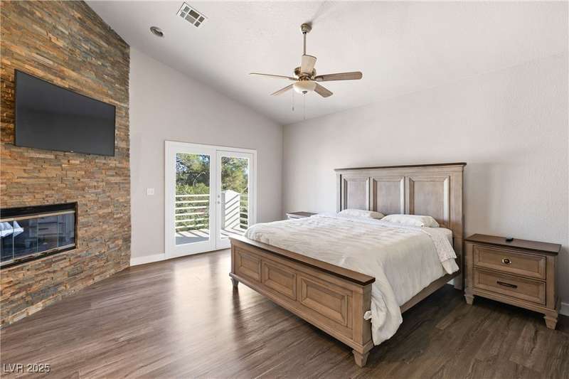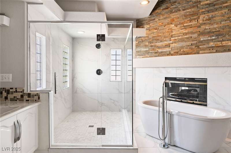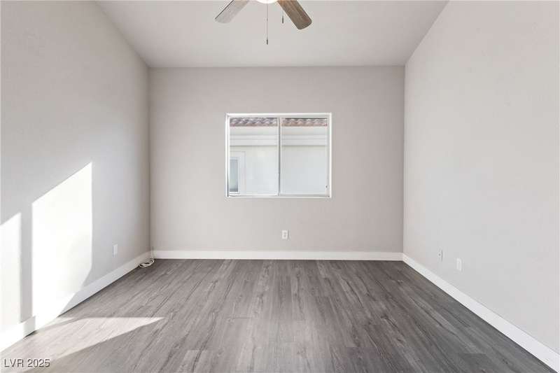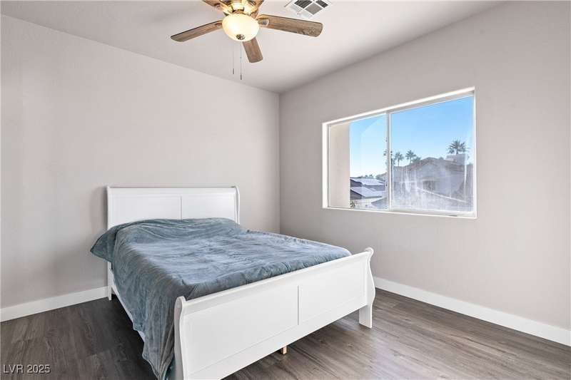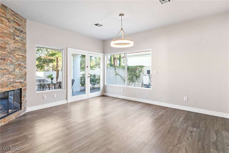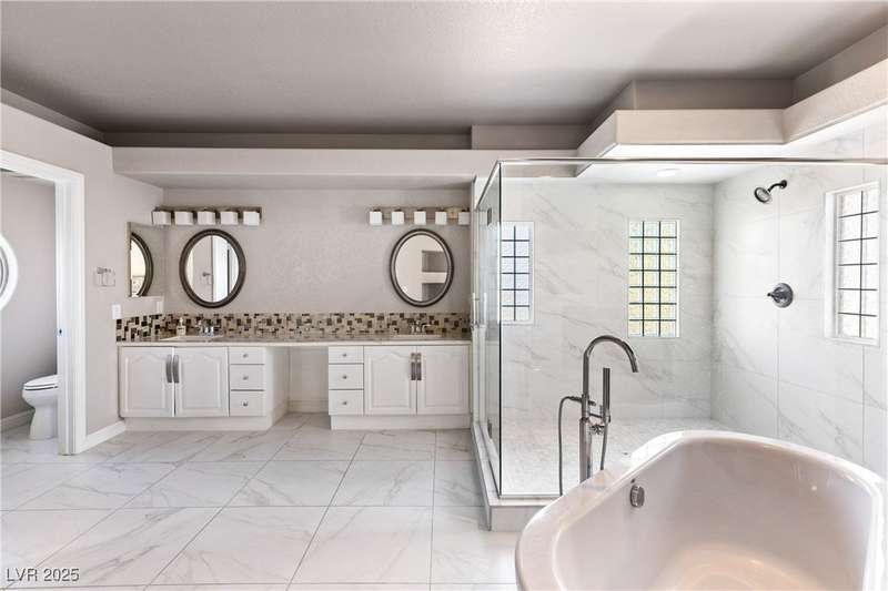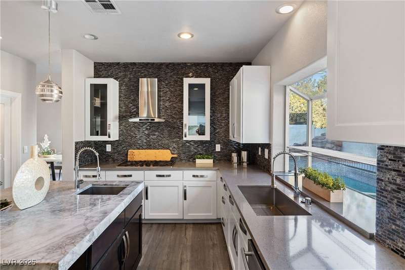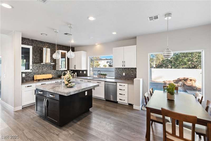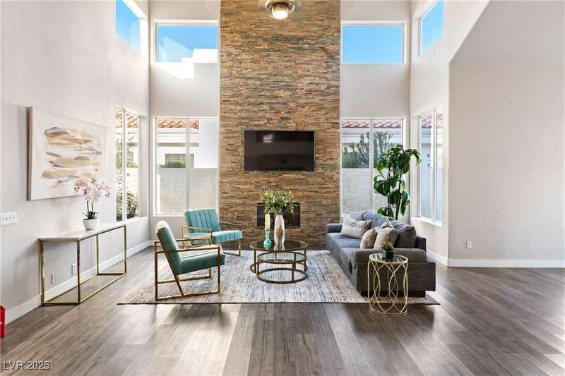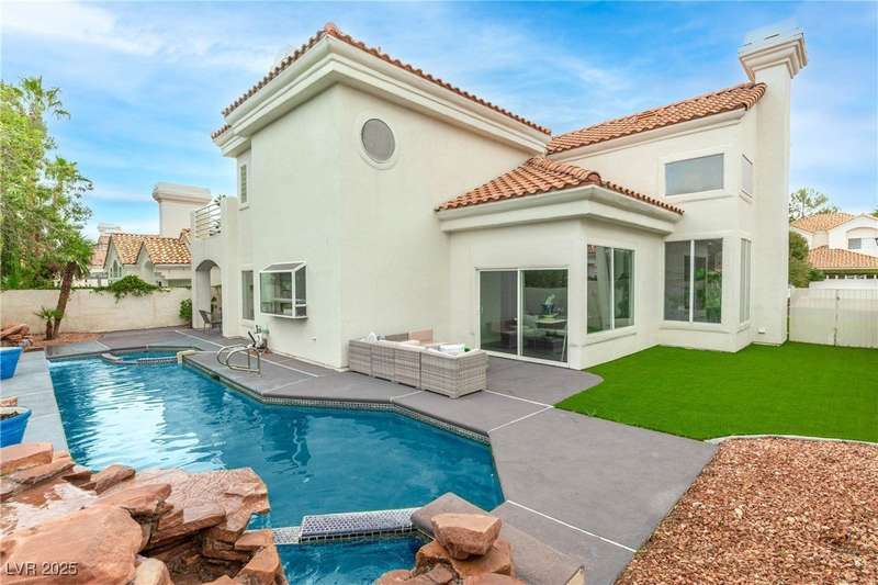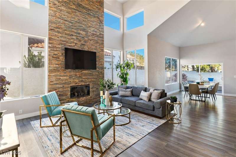 Only 450 feet to the lake, this 5-bedroom, 4-bath, 3-car garage home sits in Desert Shores, one of Las Vegas’ most sought-after communities known for its mature landscaping, trails, and rare lake access. Features two primary suites, including a downstairs primary with shower and an upstairs primary with balcony overlooking the pool. Renovated in 2021, the kitchen offers white cabinets, a walk-in pantry, chef’s refrigerator, stainless steel appliances, and a large double-thickness granite island. Two 2-way fireplaces (one between the breakfast nook and family room, another between the primary bedroom and bathtub) add warmth and style. The backyard is built for entertaining with a covered patio, zero-maintenance turf, and an inground pool with spa and waterfalls, plus no rear neighbor. Harbor Cove residents enjoy three lakes, a swimming beach, clubhouse, picnic area, and lakeside walking paths in a peaceful, well-established neighborhood.